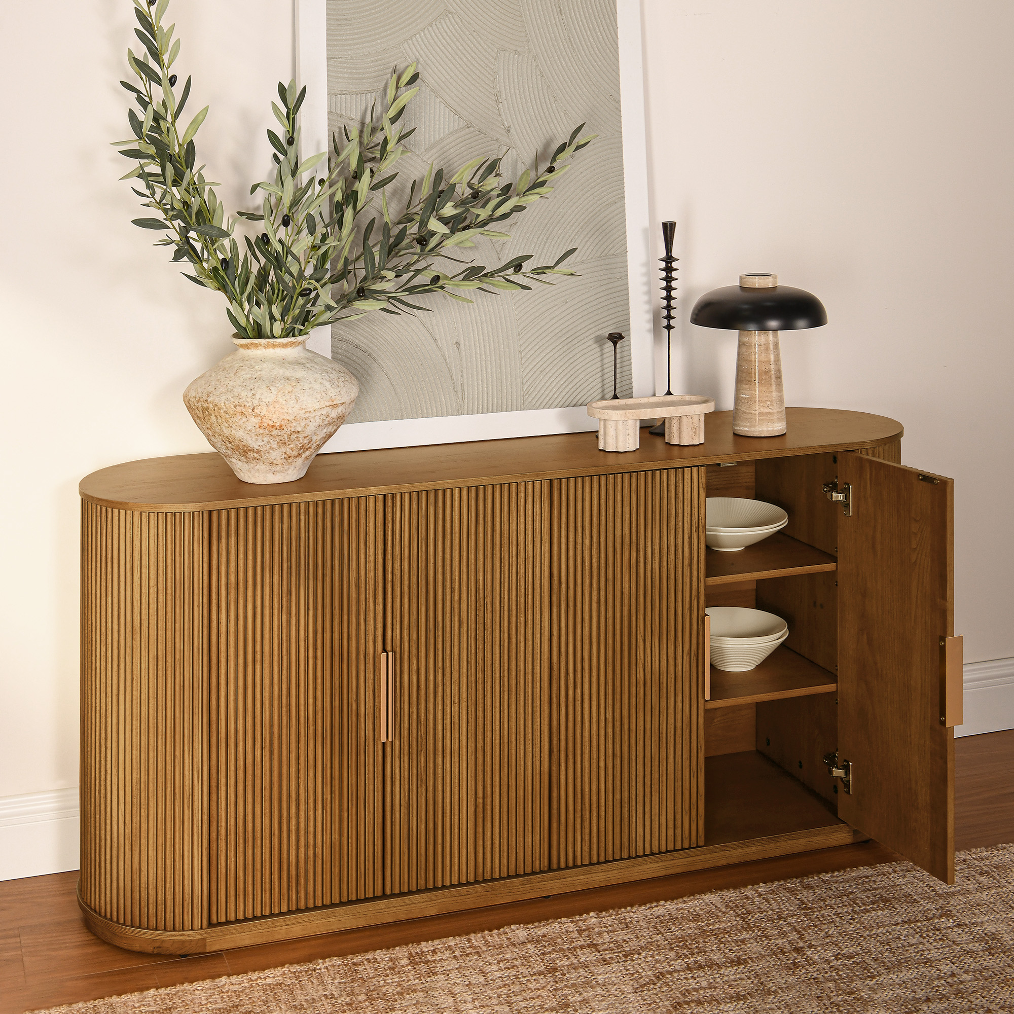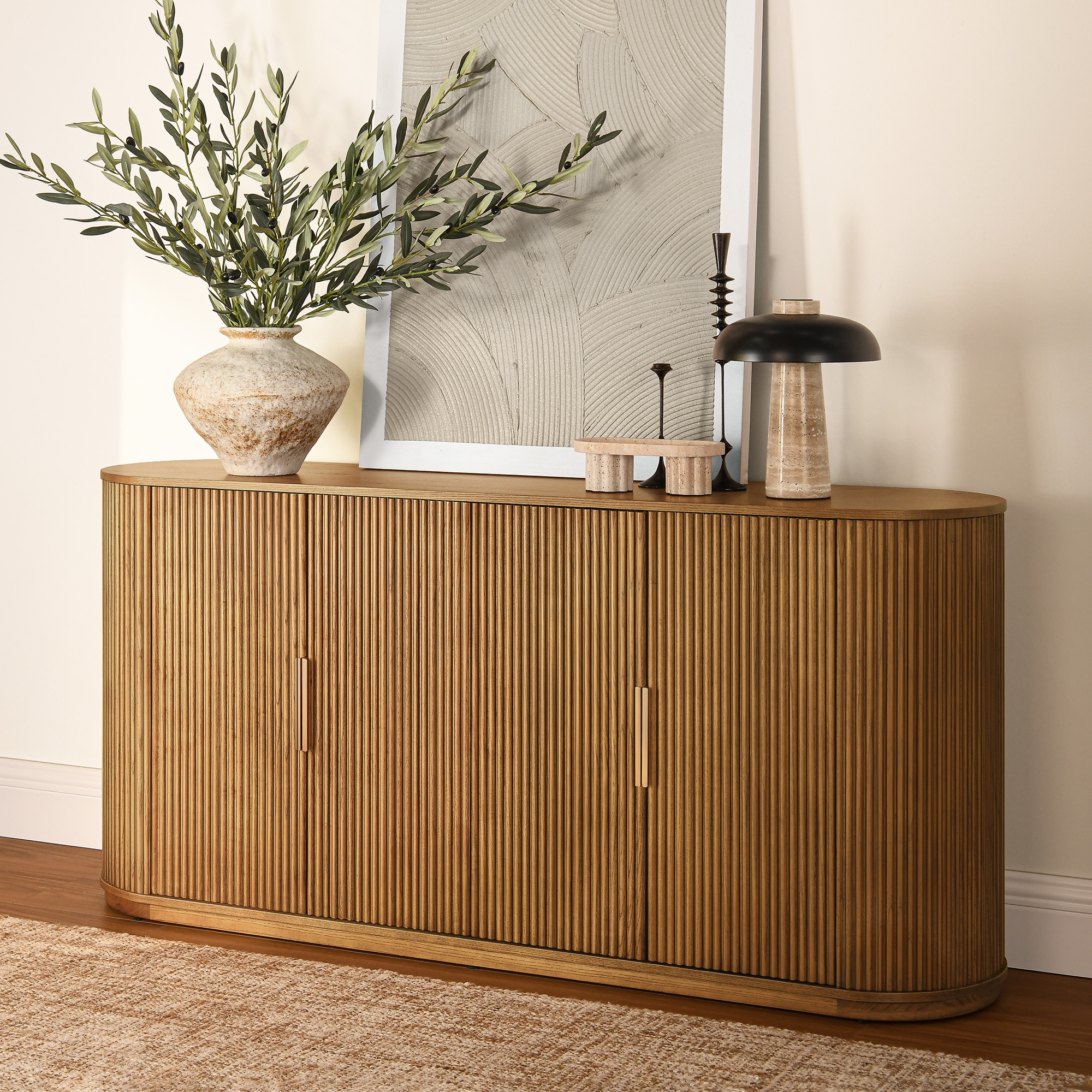 The fluted wood sideboard with functionality, and quality craftsmanship to offer a modern storage solution that not only meets practical needs but also enhances the overall aesthetic of the room with its unique and contemporary design.sideboard type:Sideboard, finish:Ash Wood Veneer, feature:Adjustable Shelves, color:Natural, material:Plywood, material:Solid Wood, number of shelves:4