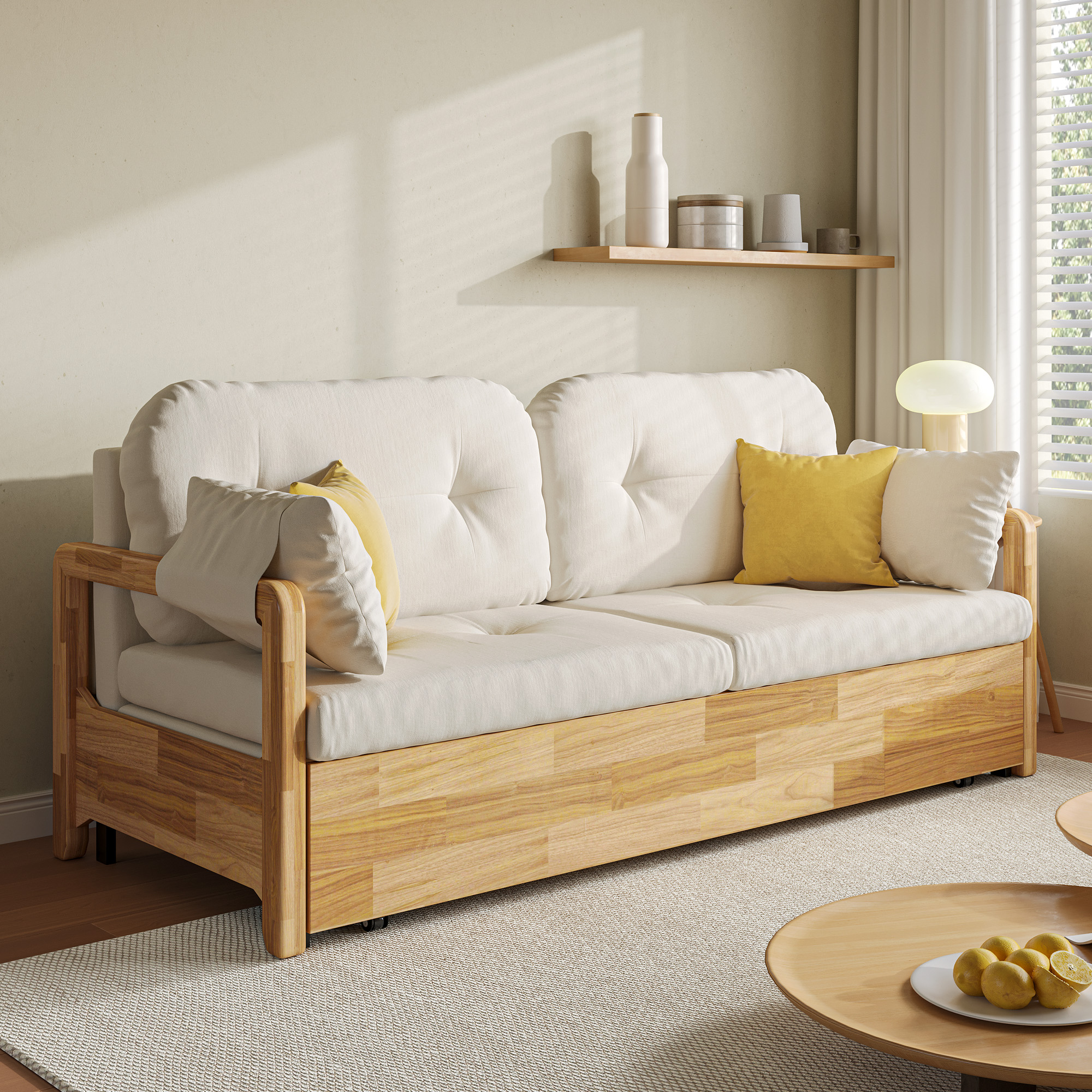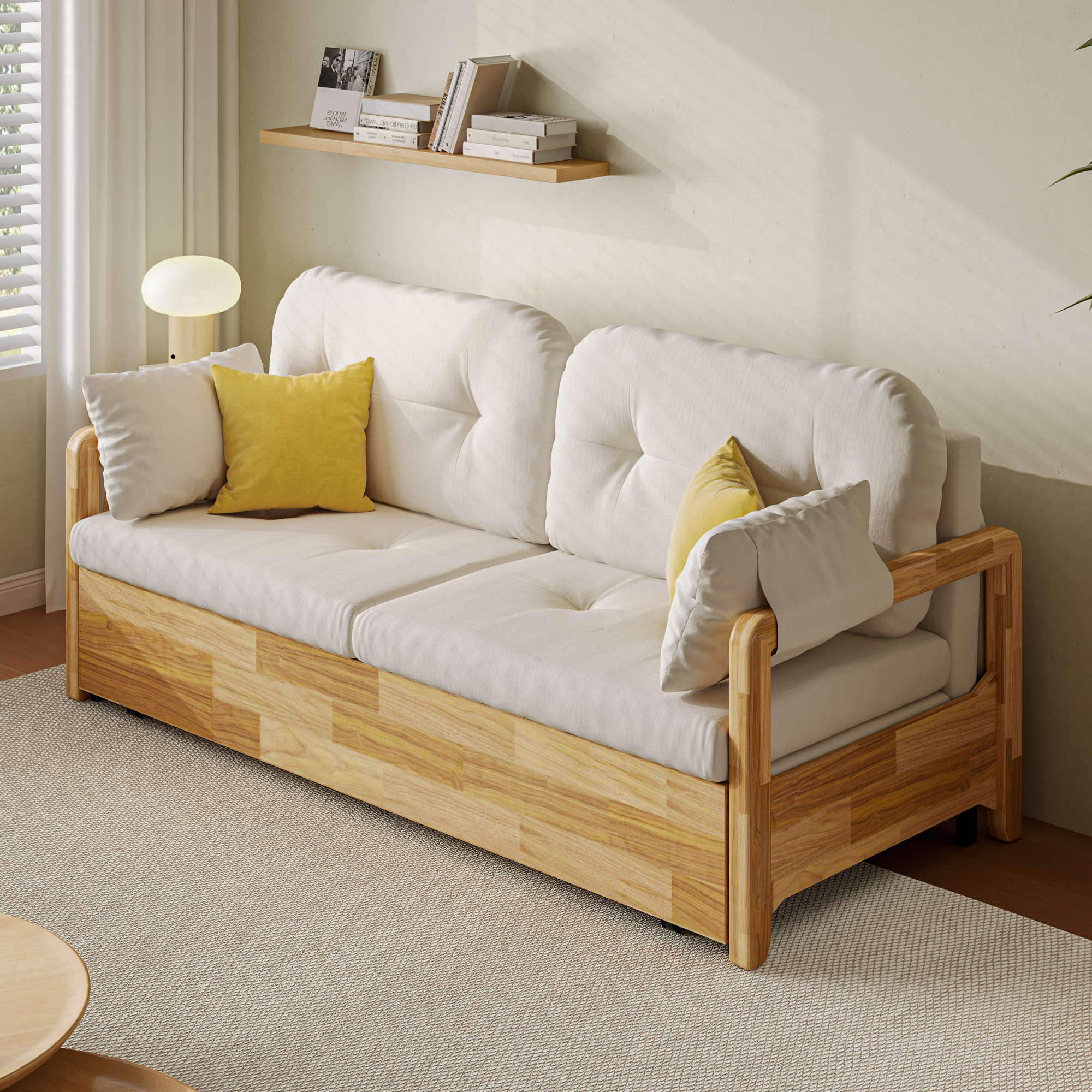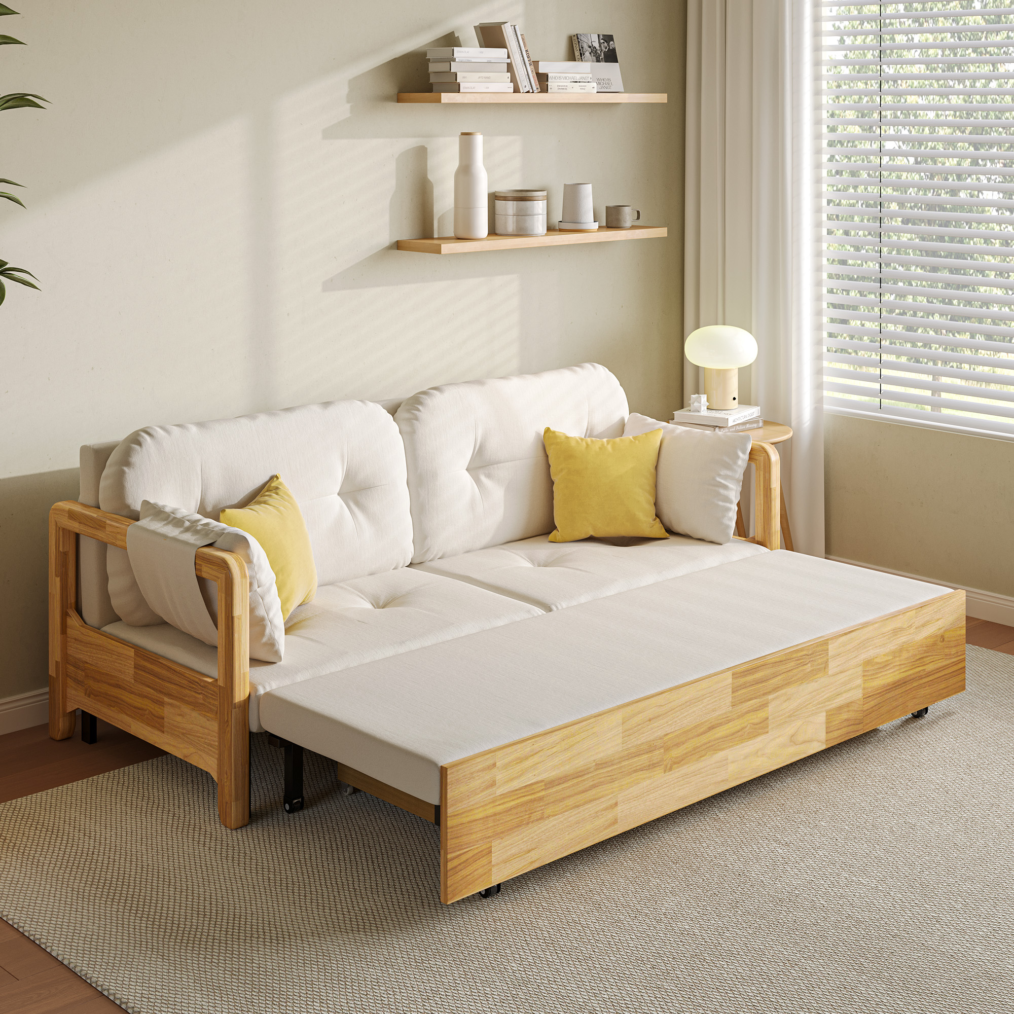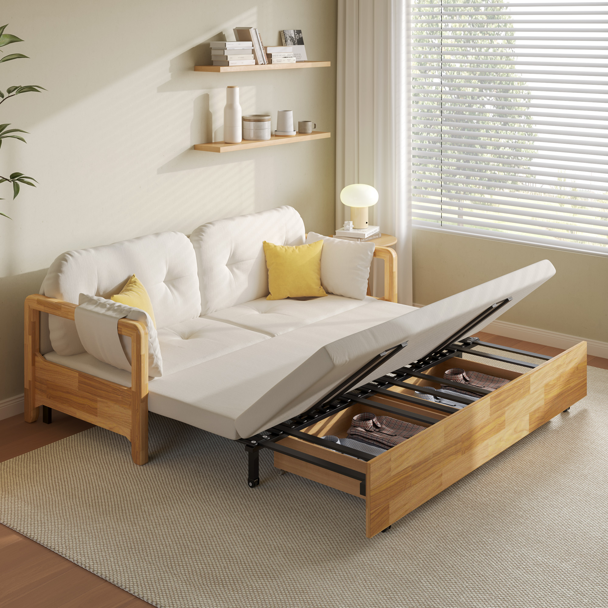 73 inch stylish modern sofa bed with natural solid wood accents. Made of rubber wood, carbon steel, and breathable cotton linen. Features hidden storage for added functionality. The seating area is carefully crafted to ensure proper support for your body, allowing you to sit or lounge in a relaxed and comfortable.color:Beige, filling:Foam, style:Modern, toss pillow included:2, upholstery material:Cotton Linen, frame material:Rubber Wood, seating capacity:2-3, frame material:Carbon Steel, sofa type:Sofa Bed
