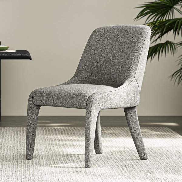 Meet Benton. This dining chair features a beautifully intertwined design with soft curves and subtle splayed legs.The architectural frame is fully upholstered in soft, durable fabric choices for comfort and worry free everyday use. The frame is generously padded with high-density foam and a soft poly blend topper. High-performance fabric allows for everyday use with easy cleanup.
