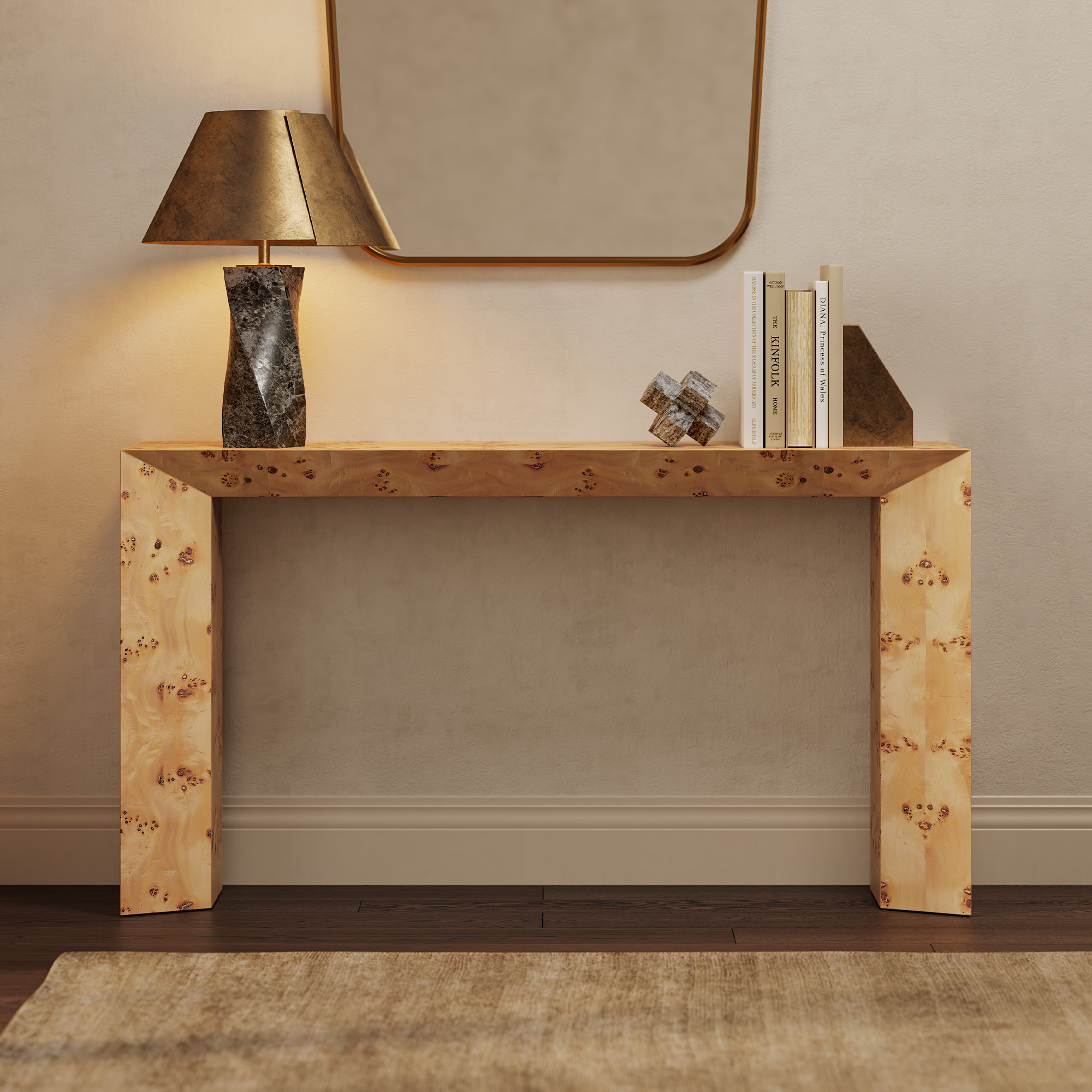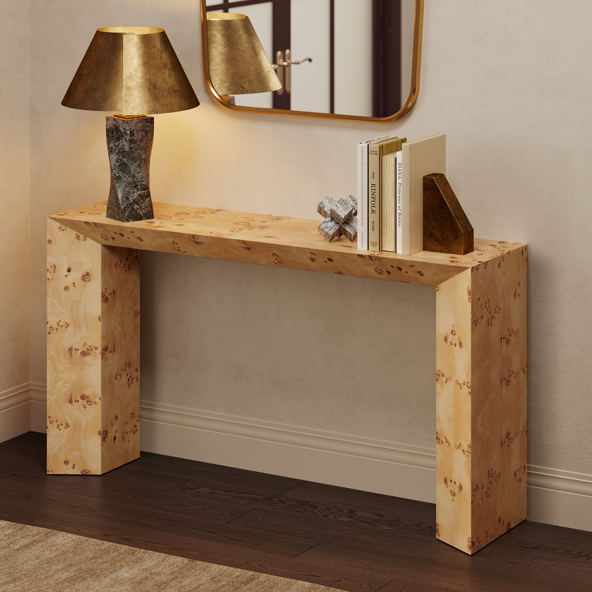 Striking Wood Console Table featuring unique burl wood veneer. Its minimalist, sculptural design adds natural elegance to any entryway or living space. A statement piece with organic appeal.shape:Rectangular, finish:Burl Veneer, color:Honey, tabletop material:Engineered Wood, material:Engineered Wood