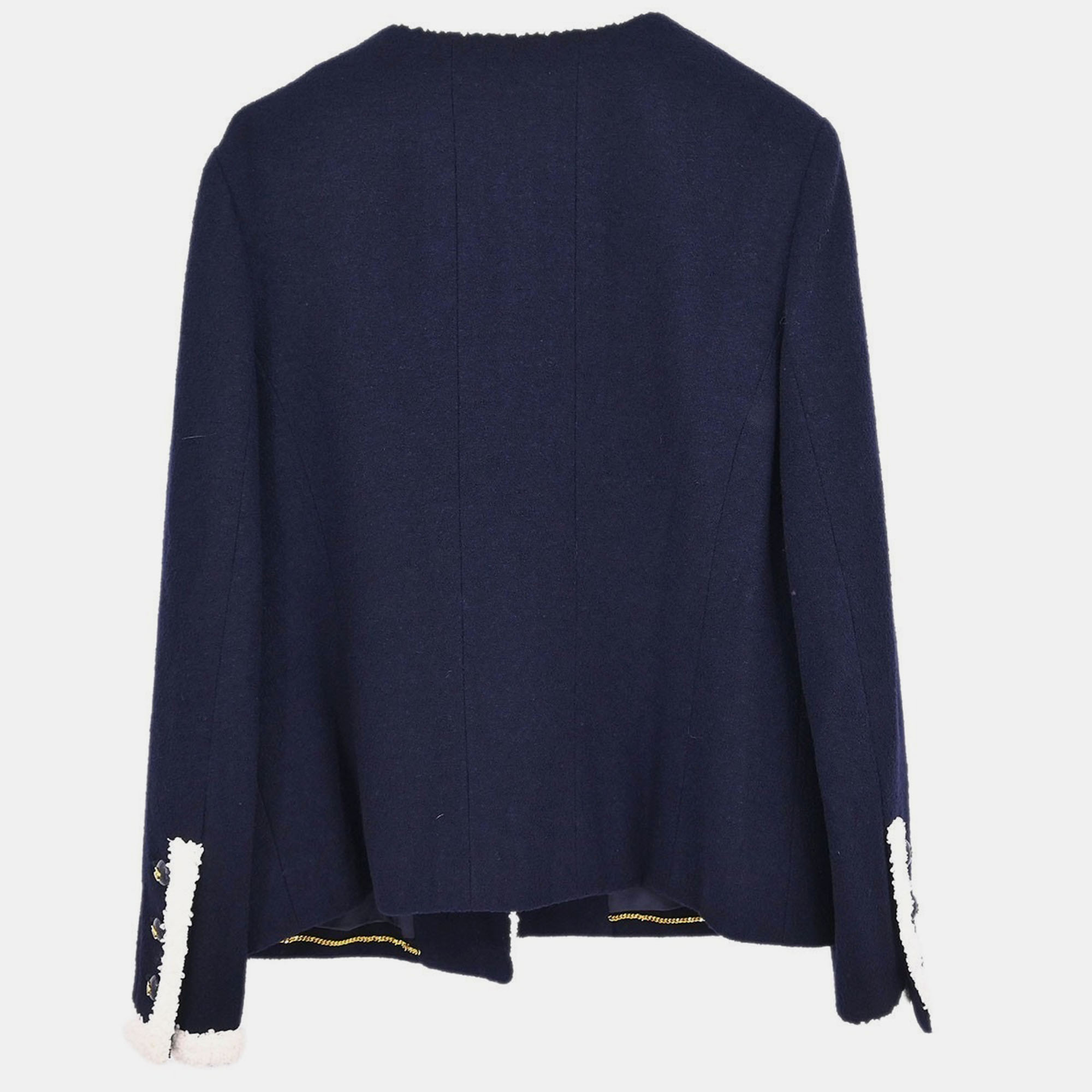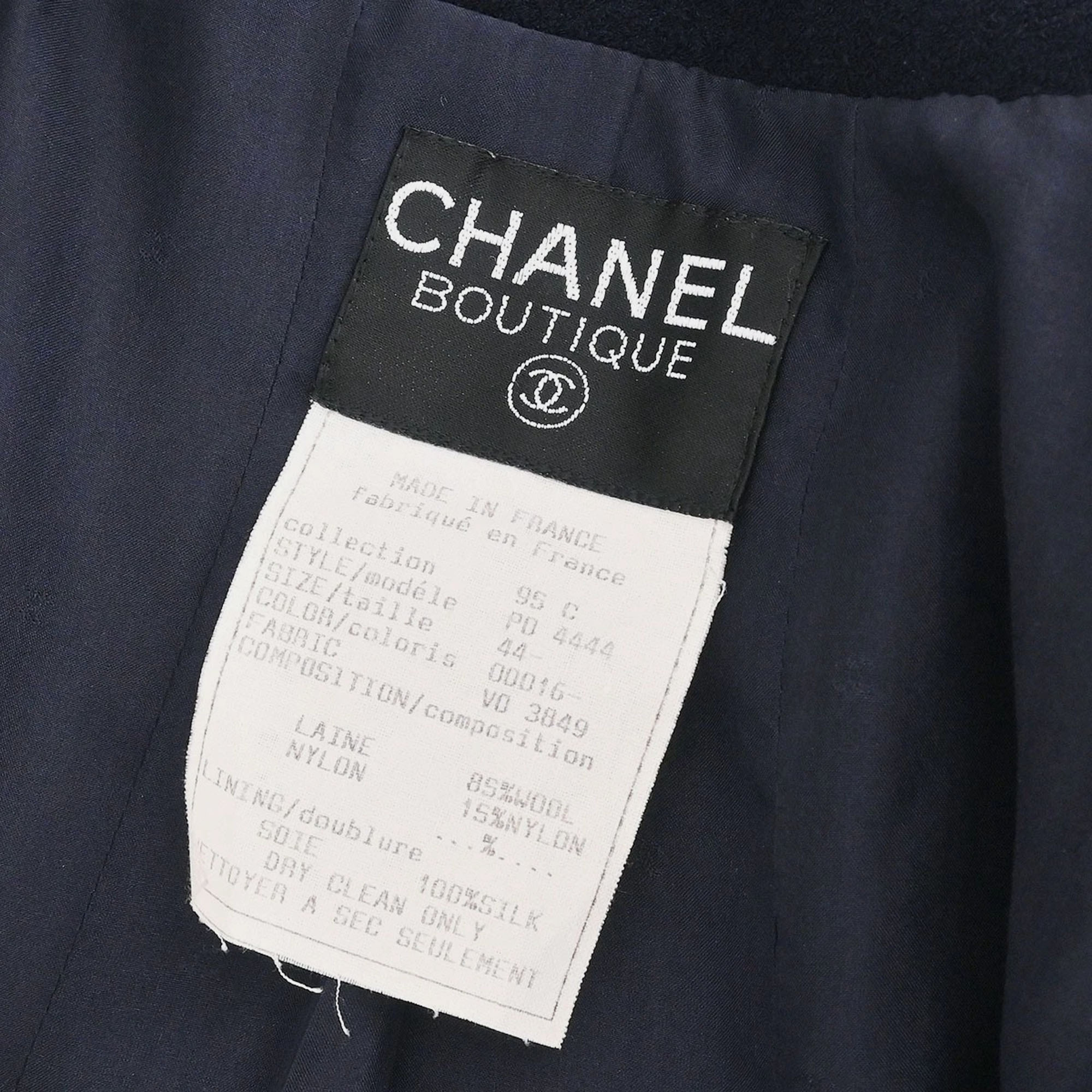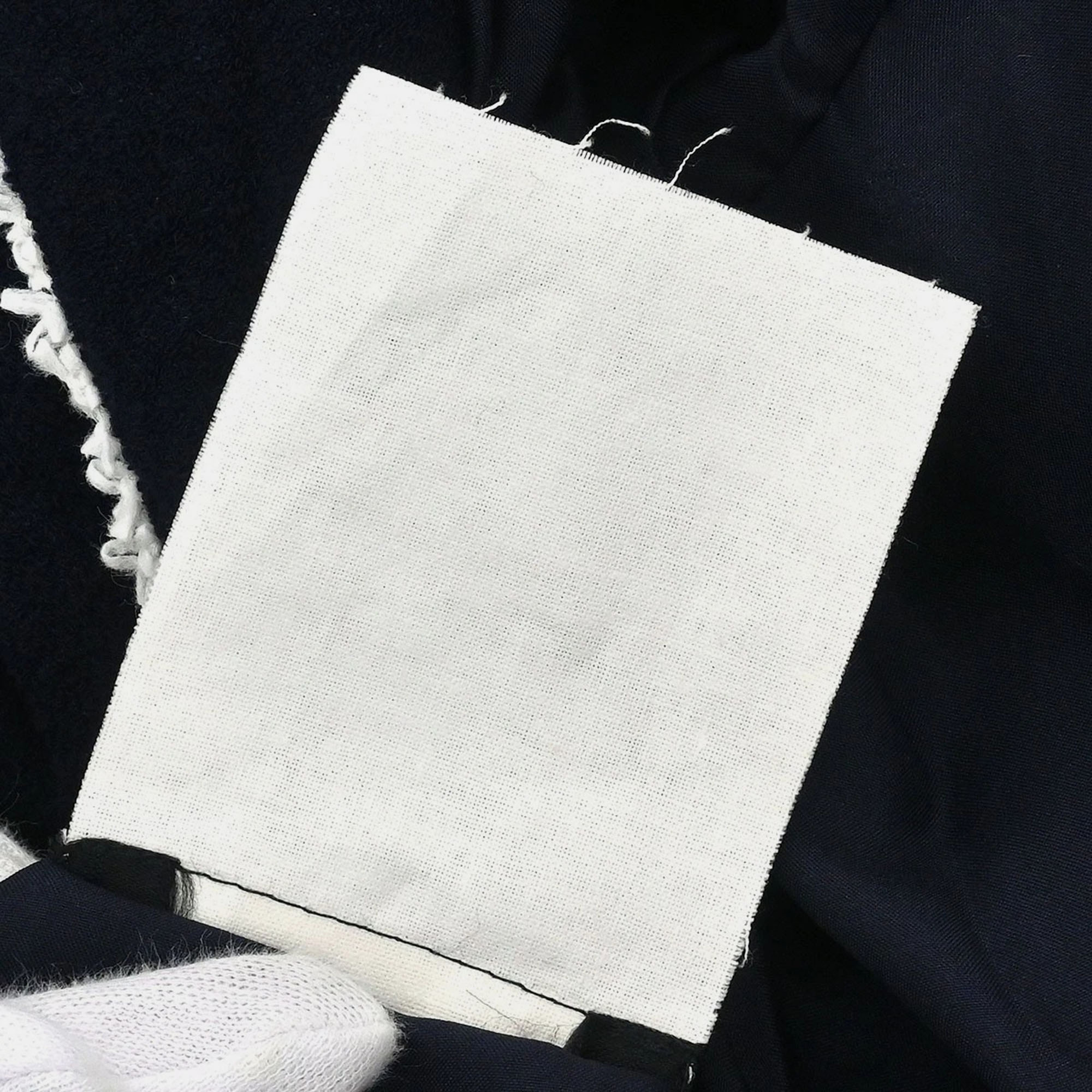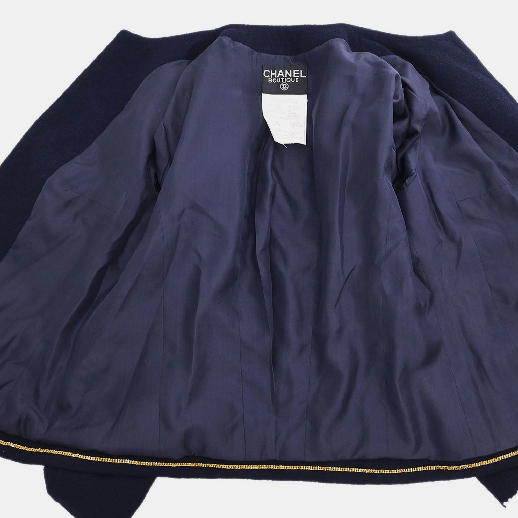 A masterclass in restraint, this navy Chanel jacket opts for quiet authority over embellishment. The collarless silhouette invites modern interpretation, while its tailored form preserves a timeless allure. For those who understand that simplicity is the ultimate sophistication.