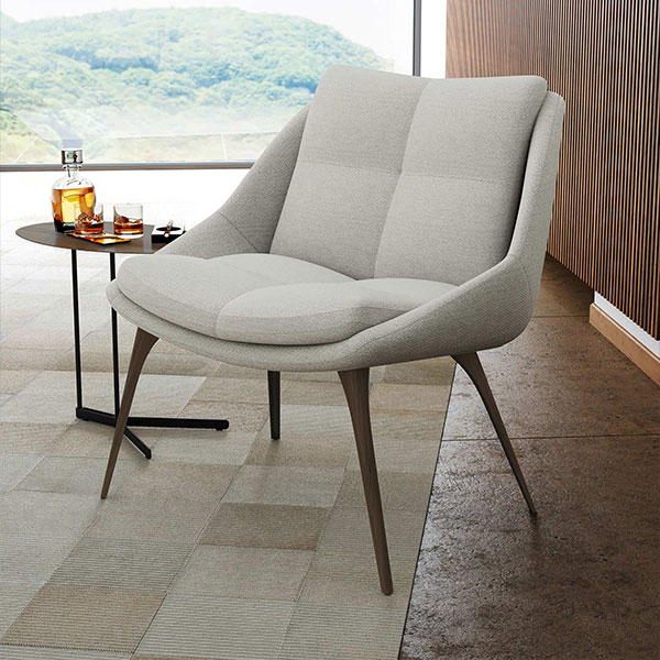 With its refined formal or casual form, the Columbus Lounge Chair is as comfortable as it is intriguing. Tufting and cross-stitching on both the back- and seat- cushion provide subtle yet luxurious accenting. Below, angular steel legs feature rich wood veneer while the inside of the legs are matte painted, adding to the overall aesthetic. Available in leather and fabric or a all-fabric finish. Sold with or without matching ottoman. Commercial grade quality.