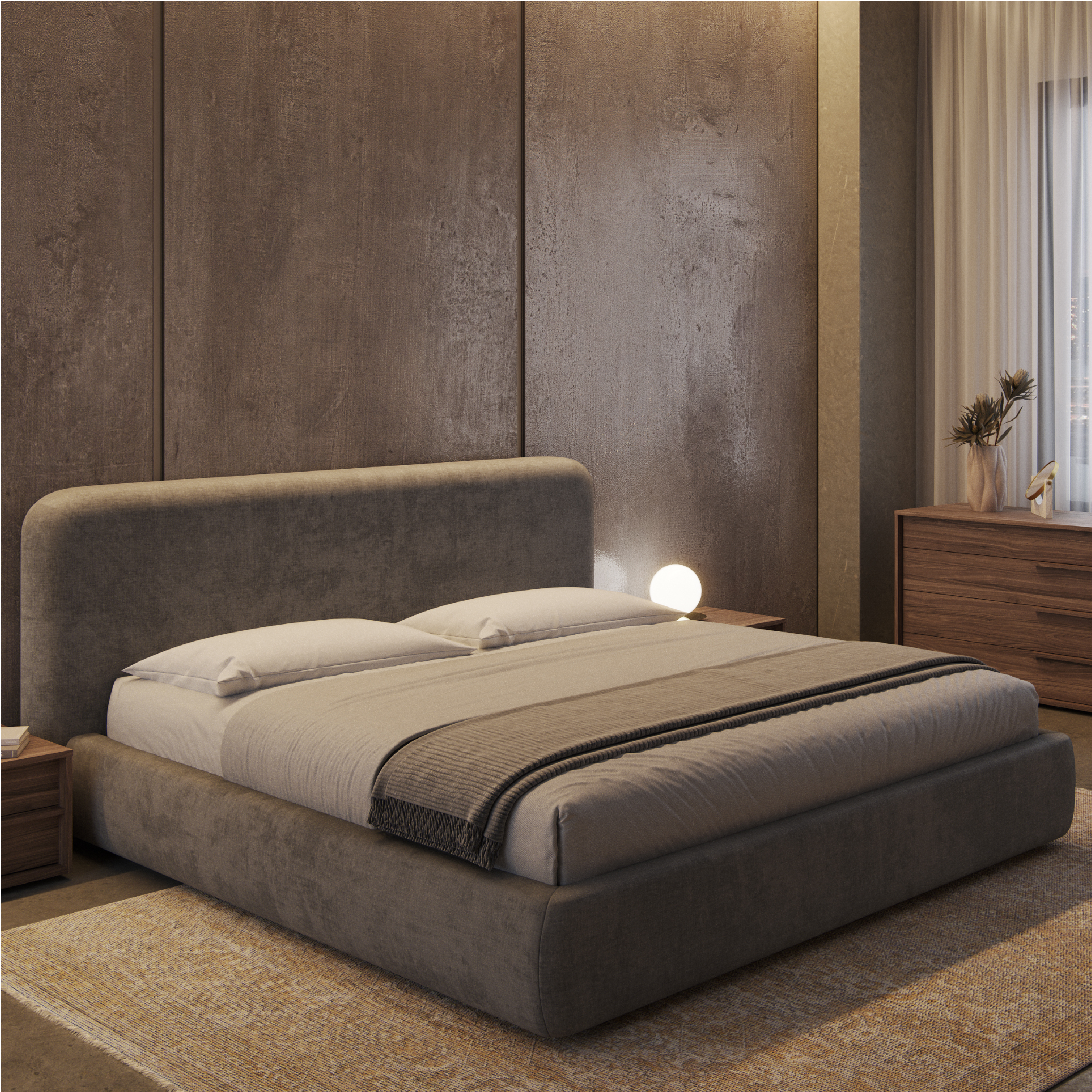 Experience the pinnacle of relaxation with the Dearborn Bed.Featuring elegantly rounded profiles upholstered in a soft durable texture, this luxurious bed exudes sophistication and comfort. The solid wood supports, and frame provide a robust foundation, while the padded headboard and frame offer a plush touch, inviting you to unwind.
