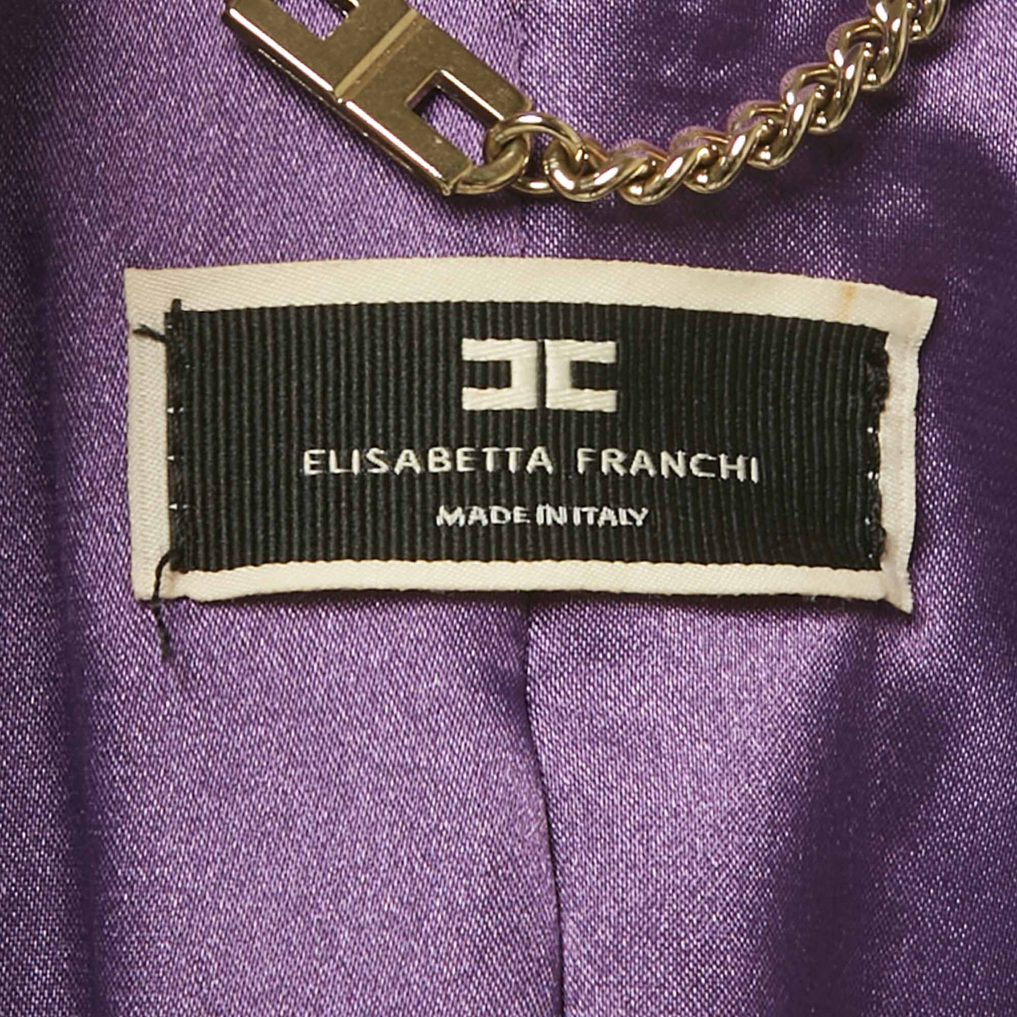 Elisabetta Franchi’s belted jacket exudes refined sophistication. Cut in structured purple crepe, it’s designed to cinch the waist and sculpt the figure with effortless finesse. Gold tone accents and tailored seams echo the brand’s glamorous Italian sensibility—perfect for pairing with slim trousers or pencil skirts for an empowering finish.