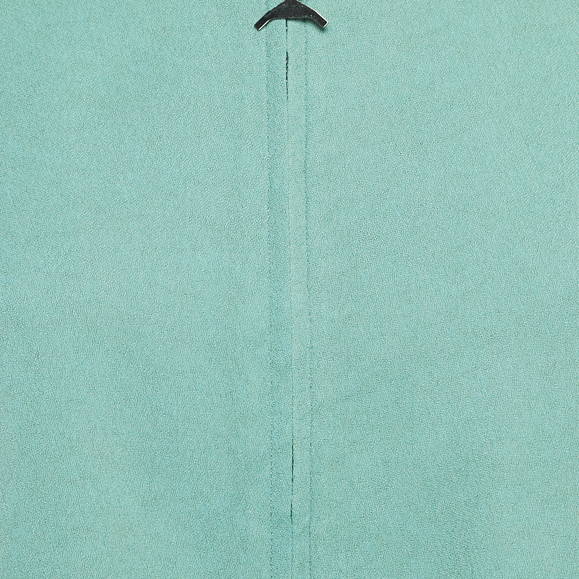 Emporio Armani’s zip up jacket in mint green crepe combines tailored lines with soft texture. A versatile layer, it elevates casual looks with a subtle sense of refinement.
