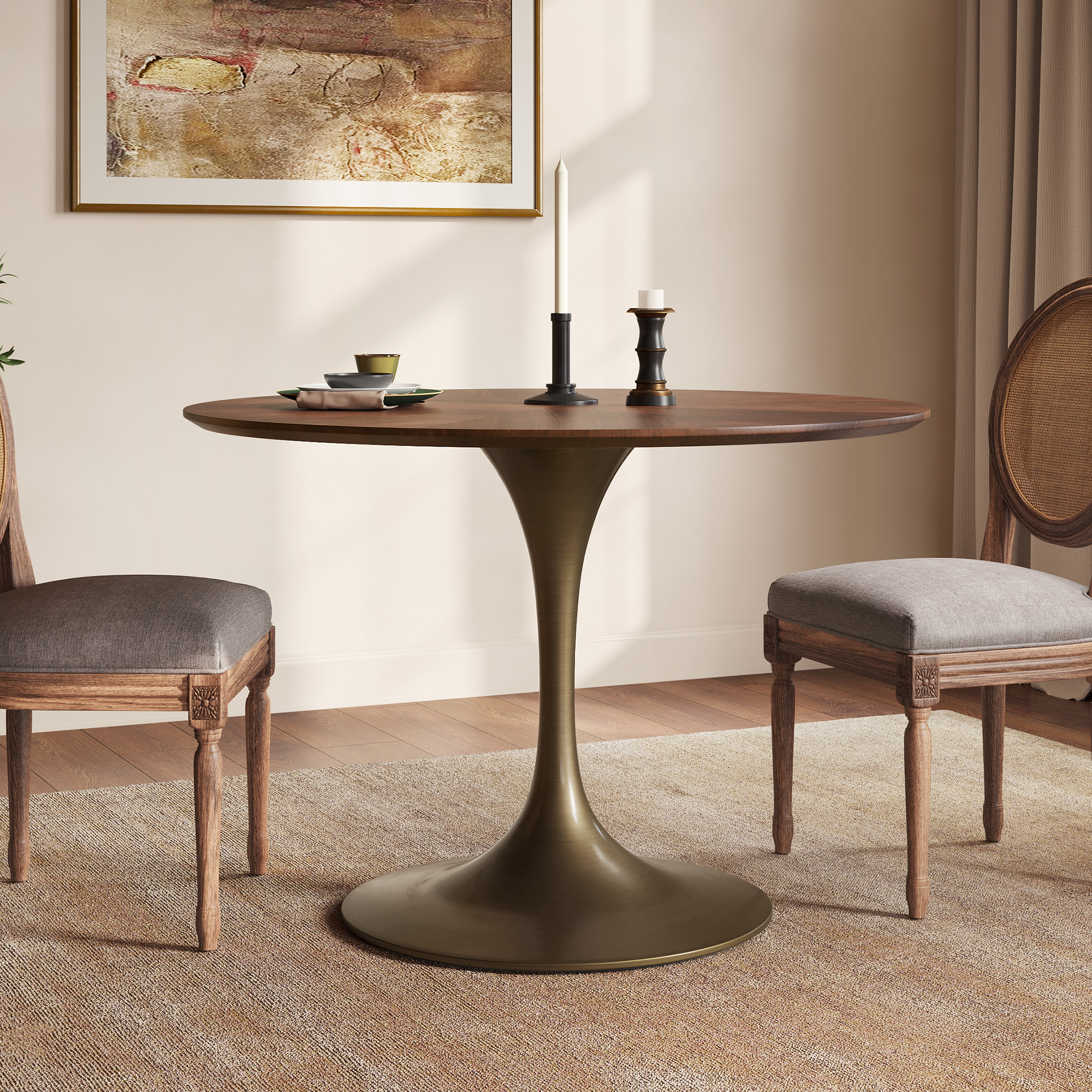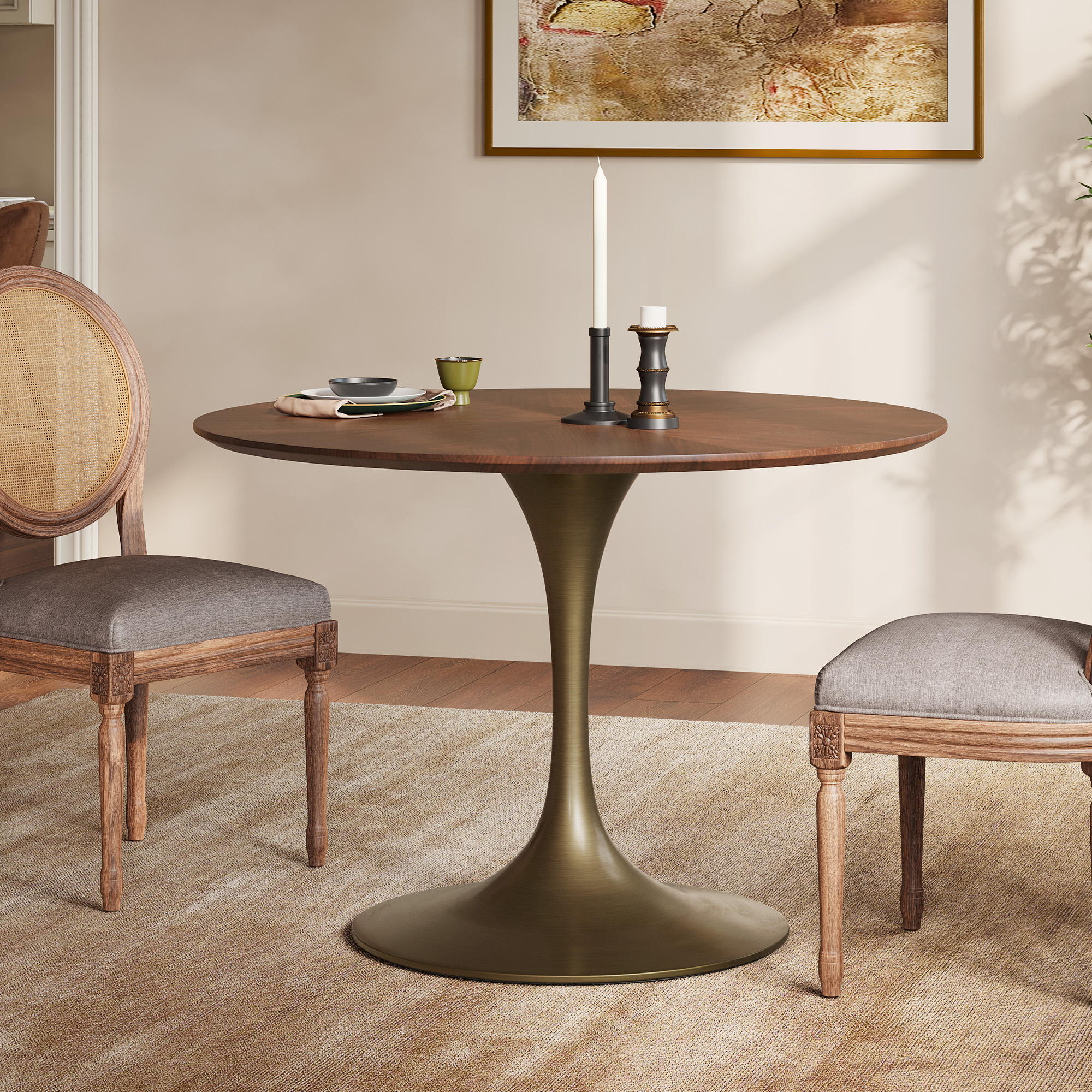 This mid-century round dining table, seating 2 to 4, features an elegant walnut veneer top and a sculptural iron base. It blends retro charm with modern elegance for stylish, durable dining, perfect for intimate gatherings.color:Brown, shape:Round, color:Copper, tabletop material:Plywood, finish:Walnut Veneer, base material:Stainless Steel, seating capacity:2-4, style:Mid-century Modern