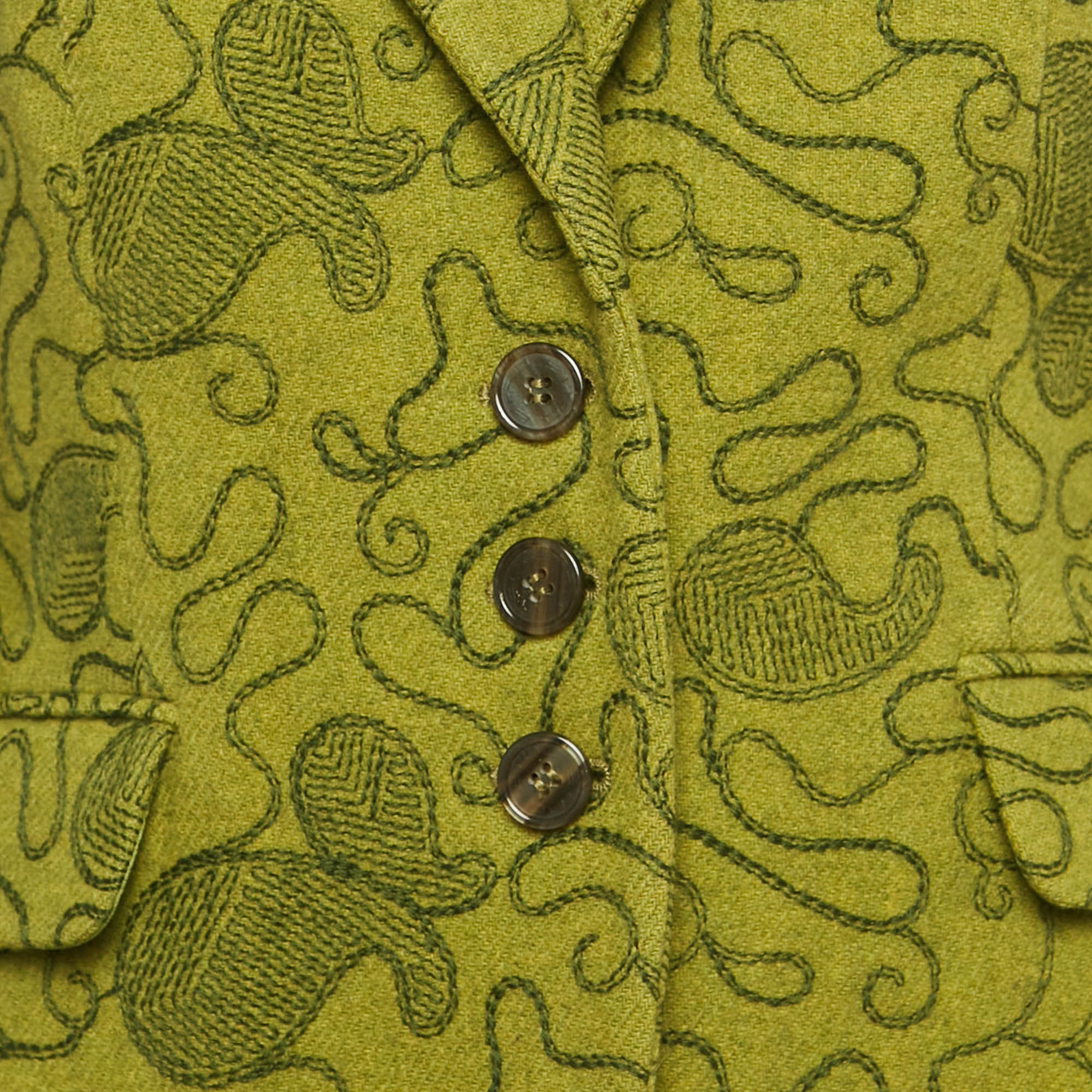Etro’s single breasted blazer in green wool is delicately embroidered with the brand’s signature motifs, bringing a dash of its bohemian Milanese spirit into tailoring. The structured shoulders and slim cut contrast with the ornate stitching for a balanced look. Layer it over a silk blouse or turtleneck for a polished yet eclectic statement.