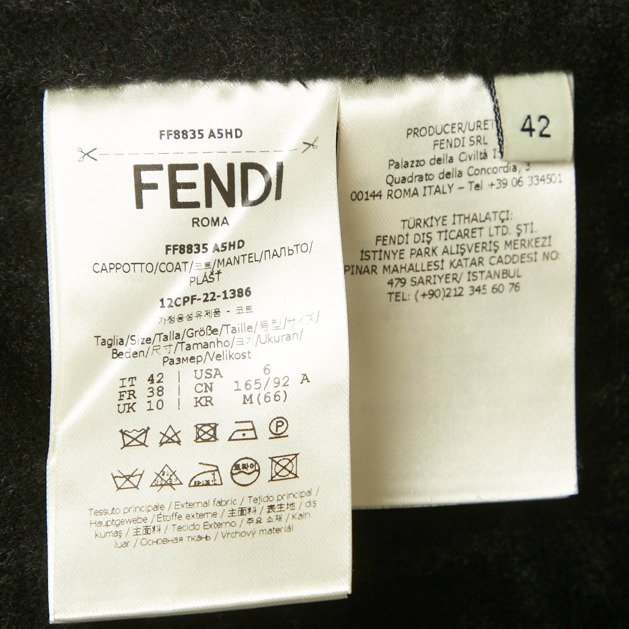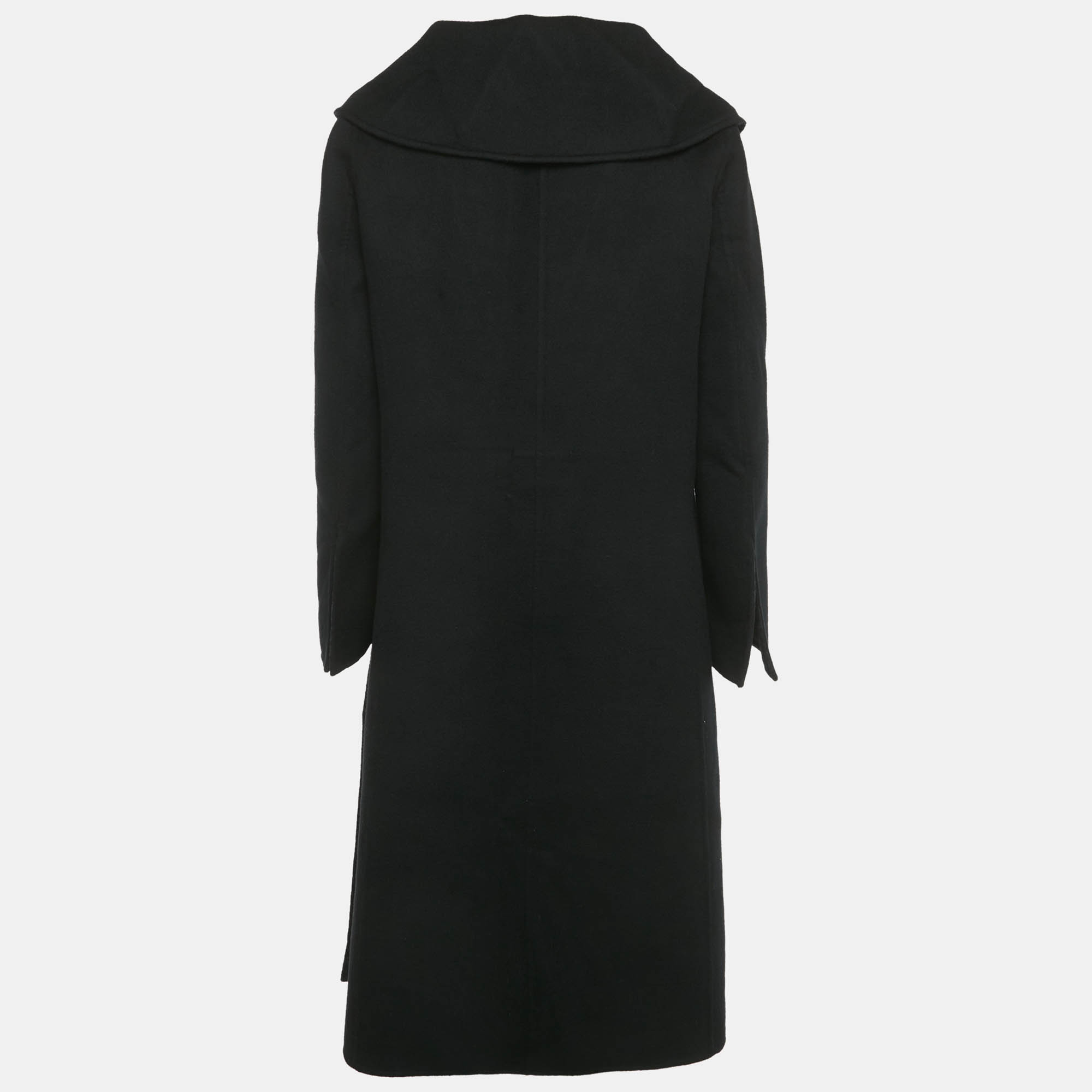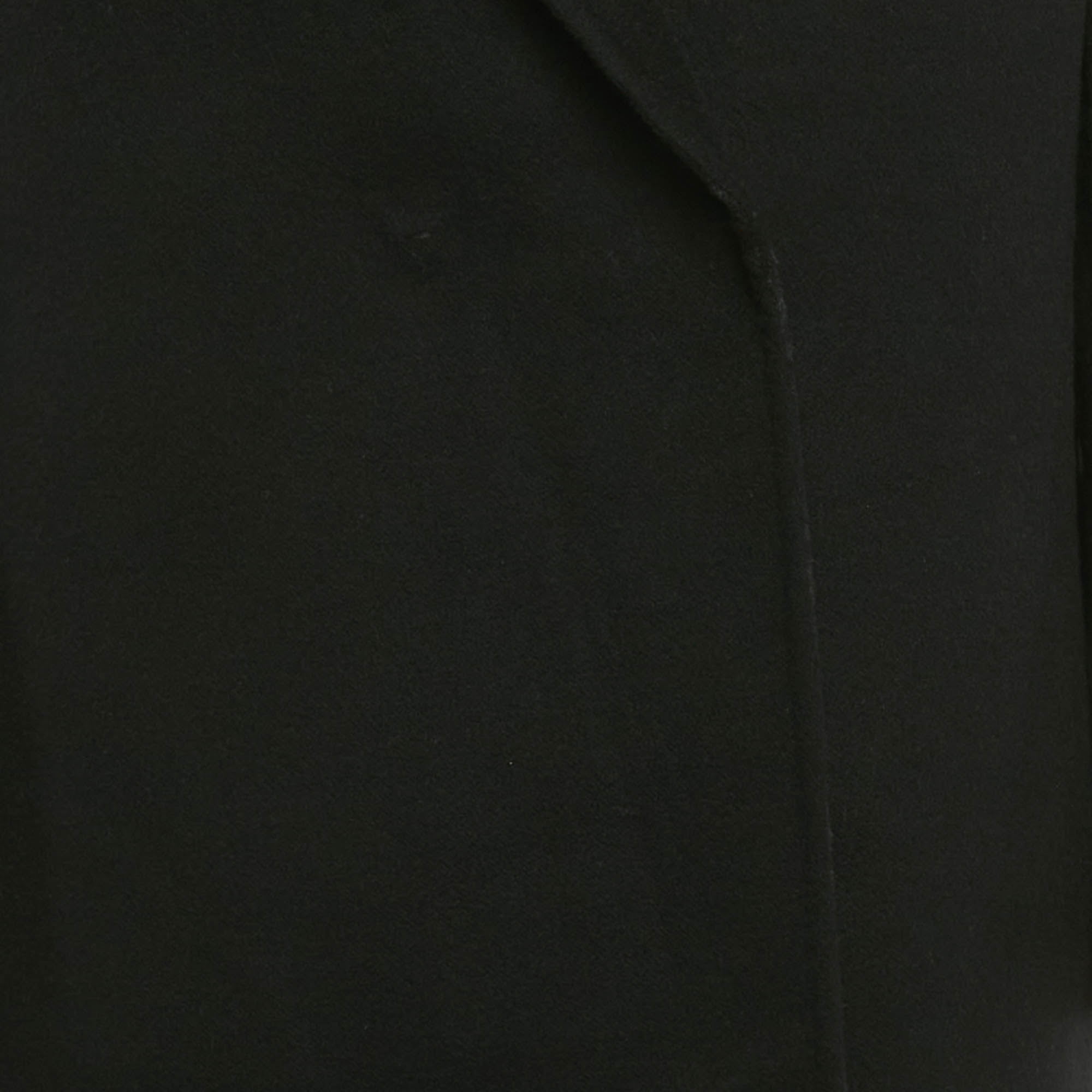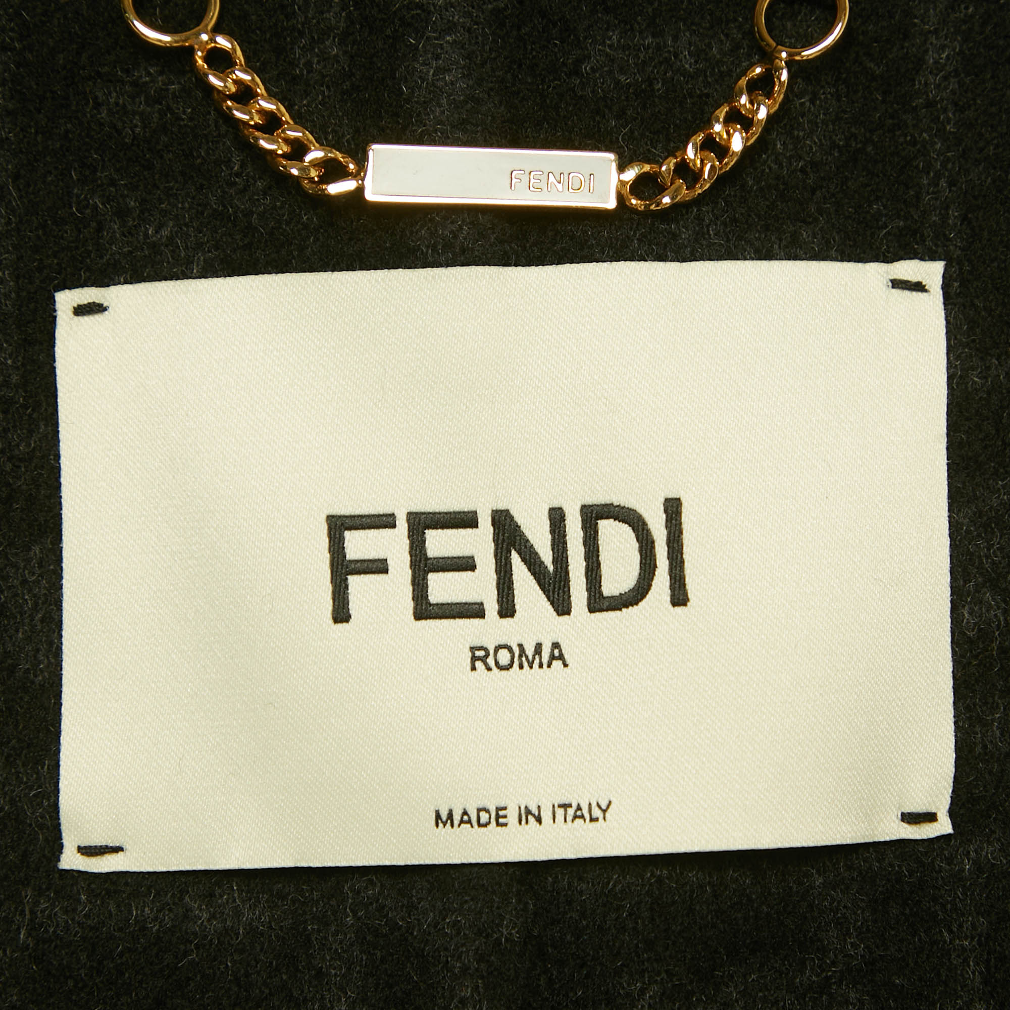 Tailored in black wool, this authentic Fendi coat features a double breasted front, wide lapels, and a longline cut that brings structure and depth to layering.