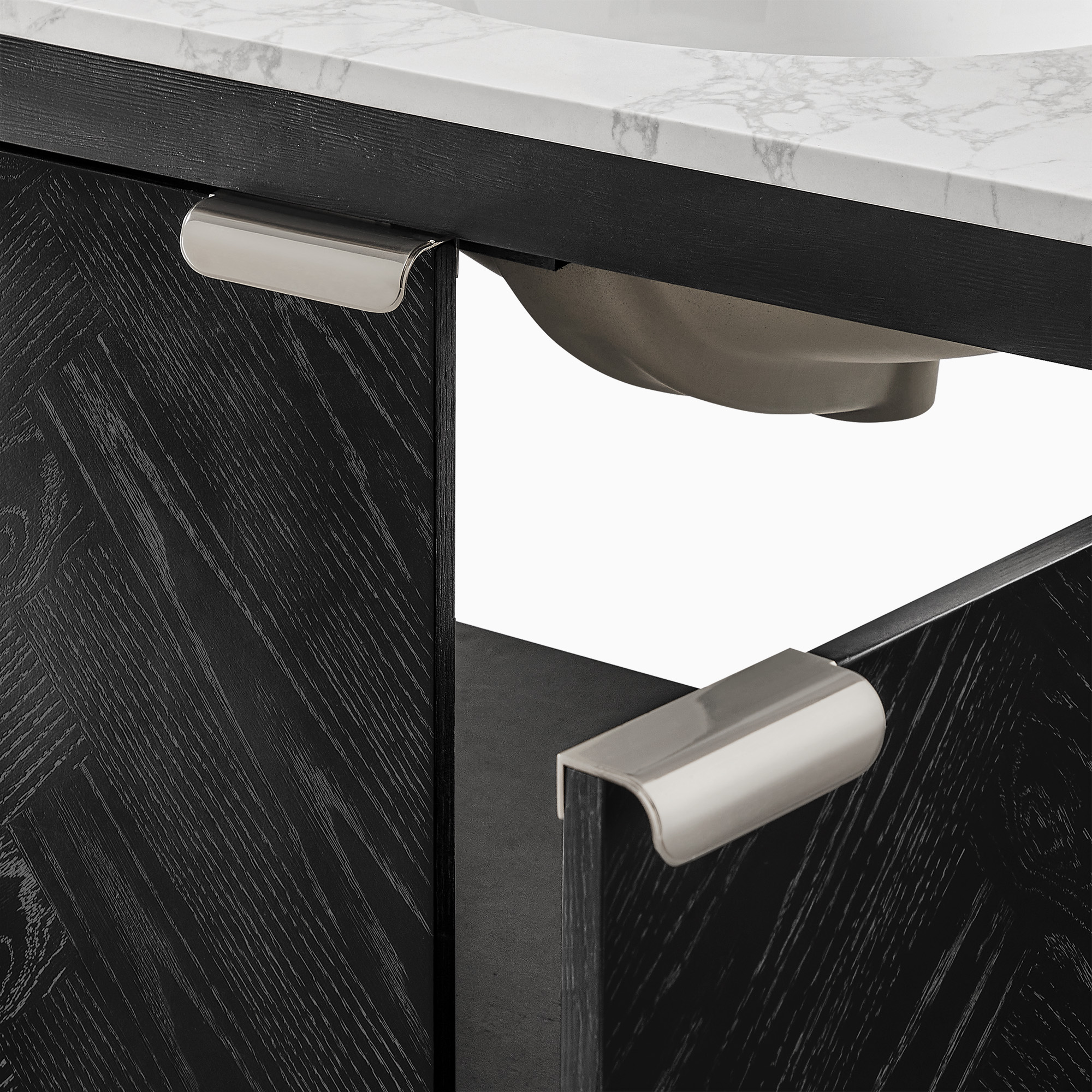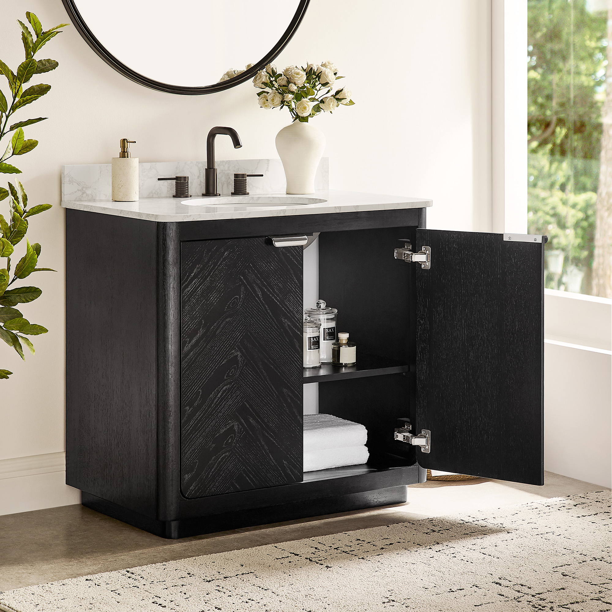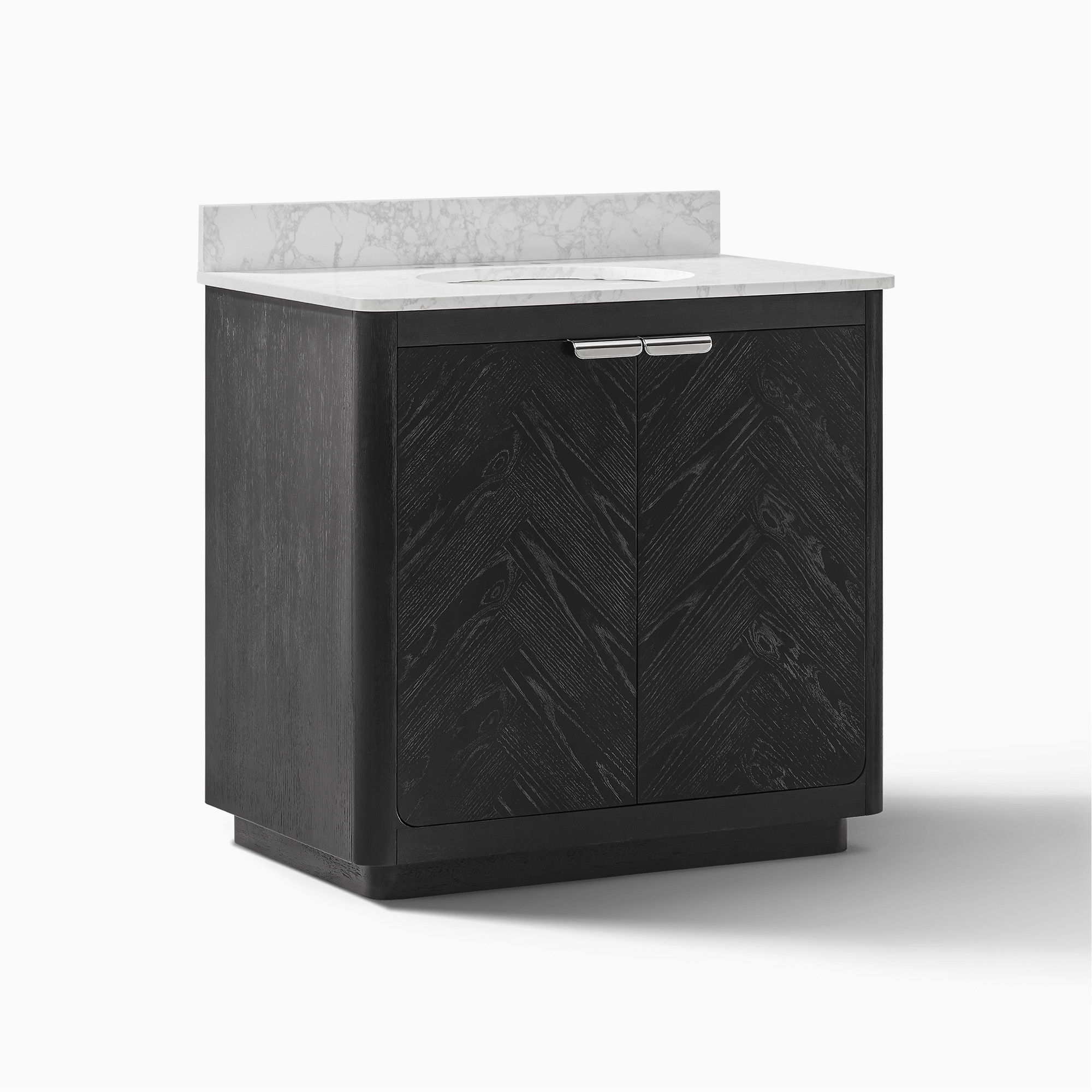 Sleek small bathroom vanities with sink feature a striking black finish and textured herringbone doors. Ample storage for a modern, organized space.color:Black, material:Marble, material:Oak, material:Solid Wood, material:Plywood, finish:Oak Veneer, feature:Adjustable Shelves, number of shelves:2, number of sinks:Single, faucet included:No