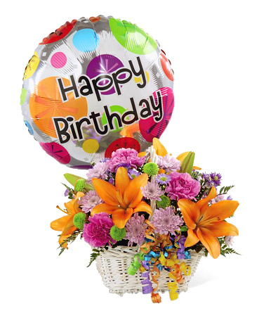 Make any birthday more special with this colorful surprise of seasonal fresh flowers designed in a basket and trimmed with a festive birthday mylar balloon. Featured blooms include lilies, carnations, Monte Casino, green button poms, or similar. A burst of color and happiness! Hooray! Florist delivery in the USA and Canada.