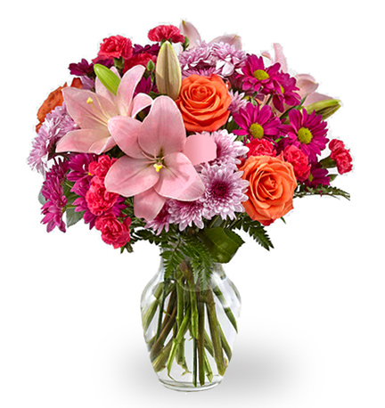 Brighten the day with this uplifting bouquet of fresh garden blooms in pretty pink, lavender and orange hues. This cheery design includes lilies, roses, daisy poms, miniature carnations, or similar seasonal fresh flower favorites designed and delivered in a quality glass vase. Bursting with beauty and joy! Approximately 18 to 20 inches in height. Some flowers may vary seasonally. Florist delivery in the USA and Canada.