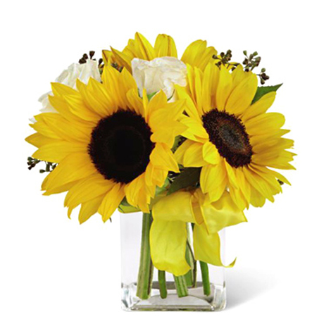 Let the sun shine in with this cheery combination of bright yellow sunflowers, white roses, and fresh greenery designed and delivered in a stylish glass vase. Simple yet sophisticated. Available in most areas from late May till Thanksgiving. Approximately 10 to 12 inches in height. FTD florist delivery in the USA and Canada.