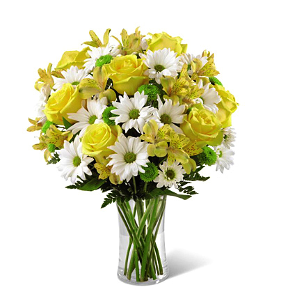 Send a bouquet of instant happiness with this cheery combination of fresh roses, daisies, alstroemeria, and more in sunny yellow and white tones. Designed with fresh foliage in a quality glass vase. An uplighting gift for any occasion! Florist delivery in the USA and Canada.