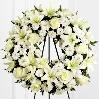 Send your deepest sympathy with this beautiful tribute featuring elegant white lilies, velvety roses, carnations, and more in a classic standing wreath design that symbolizes eternal life. An outstanding expression of support and caring. Appropriate for wakes, funerals, and memorial services. Florist delivery in the USA and Canada.