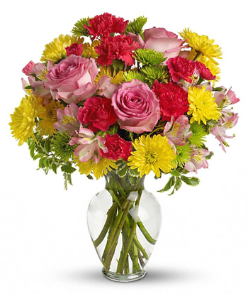 Brighten someone’s day with this popular bouquet of colorful fresh flowers designed in a tasteful glass vase. Featured blooms include roses, carnations, alstroemeria, chrysanthemums, or similar hearty favorites. Great for a birthday, get well, thanks, or just because! Florist delivery in the USA and Canada.