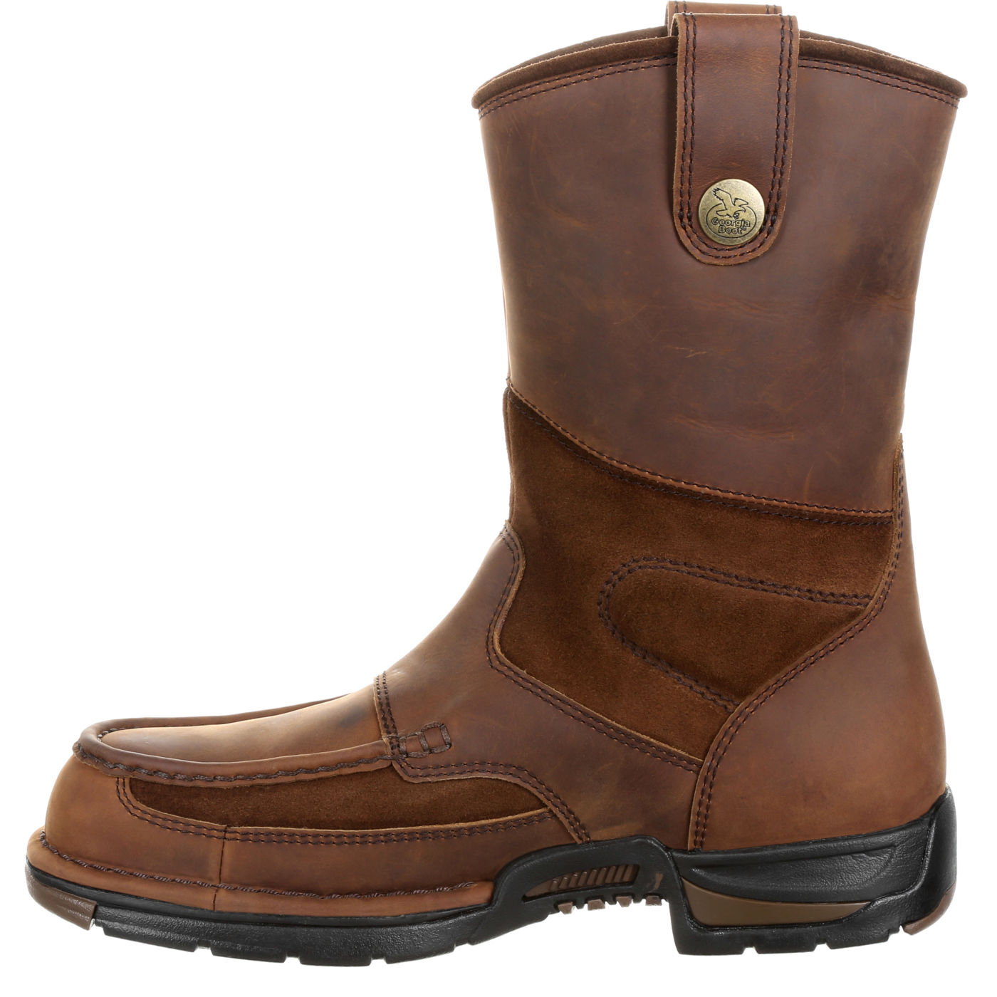 Georgia Athens Steel Toe Waterproof Wellington is a moc-toe pull-on boot.