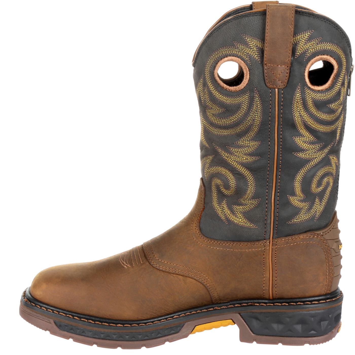 The Georgia Boot Carbo-Tec LT is built work boot tough with western style. The full-grain leather upper features a black fancy stitched shaft and brown saddle vamp with stitched toe bug. Reinforced pull holes and a rear zipper make pulling this western work boot on a simple task. The rear Counter Lock System prevents heel slippage for a secure fit and acts as a kick off for easy boot removal.
