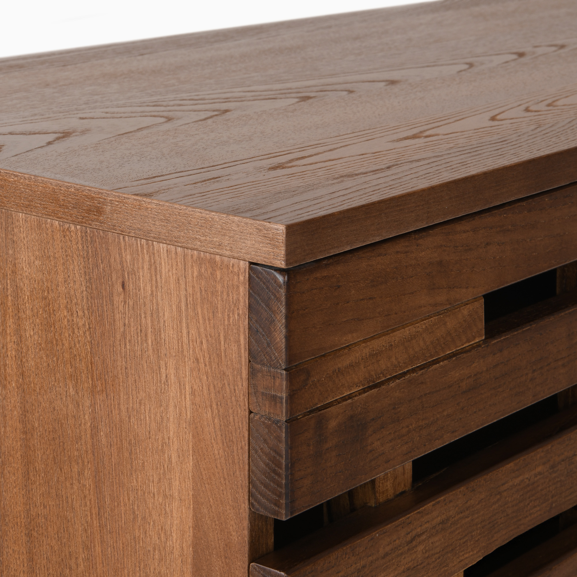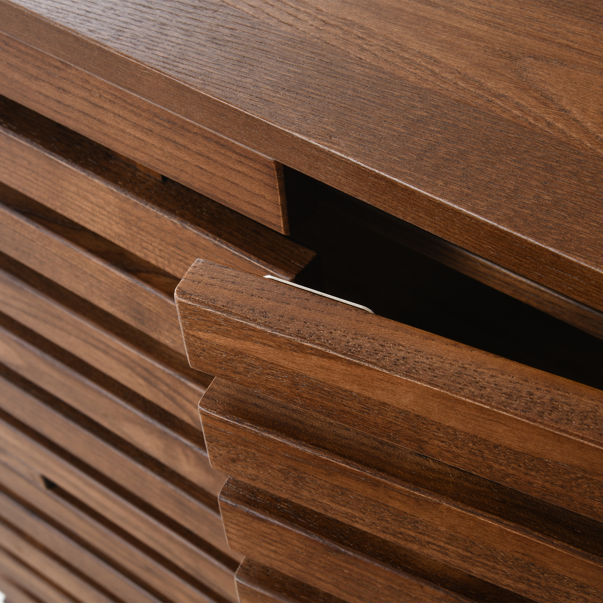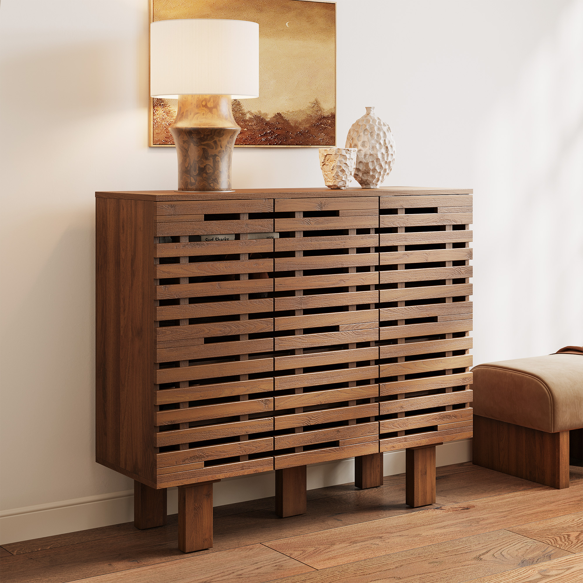 The wood shoe storage features latticed doors that add a sense of design and help maintain dryness inside the cabinet, preventing shoes from developing odors due to moisture. With its warm hues, it not only addresses everyday storage needs but also enhances the home with a touch of modern minimalistic beauty.color:Brown, material:Plywood, finish:Elm Veneer, capacity for shoes:11-20 Pairs, door material:Solid Wood, material:Solid Wood, number of shelves:10