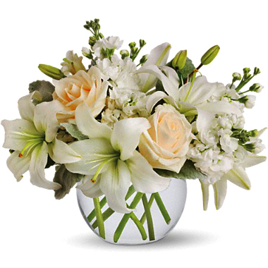 An elegant collection of white lilies, cream or or pale pink roses, stock, or similar garden fresh flowers designed in a classic glass bowl or vase. Soft and beautiful! Great for thank you gifts, hostess gifts, business gifts, and expressions of sympathy..Florist delivery in the USA and Canada.
