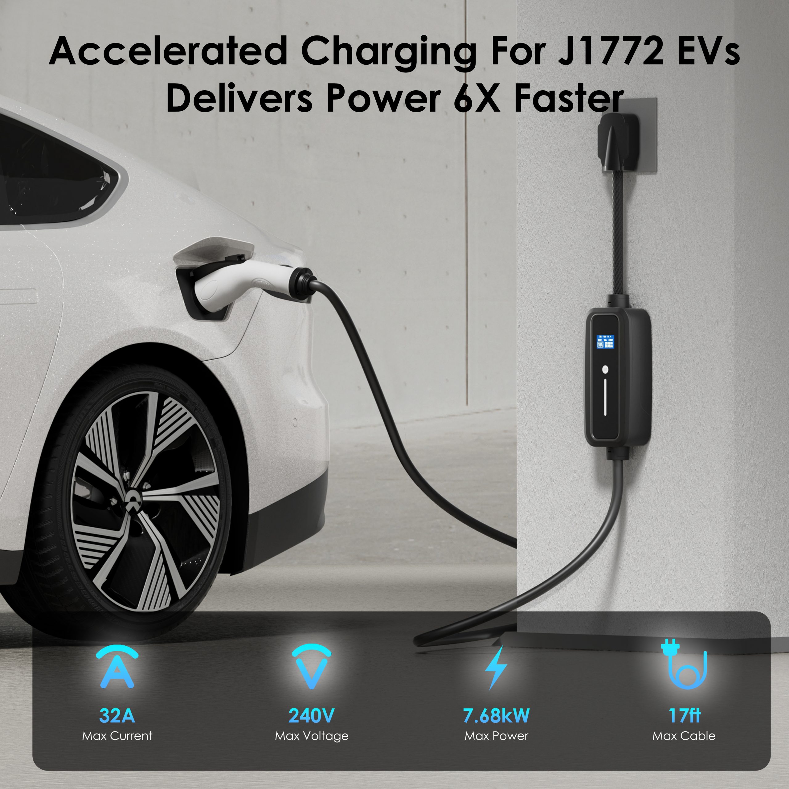 J1772 EV | 32A | 240V | LED Indicator | User-friendly Interface | NEMA 14-50 Plug | 17 ft Extension | Over-heat Over-volt protection | Real-time charging updates