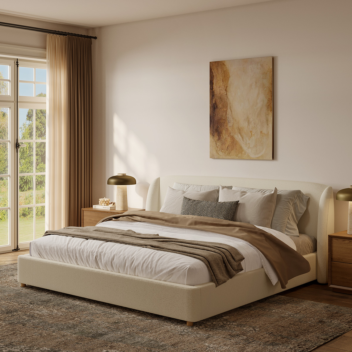 Elevate your bedroom with the Lana bouclé bed, featuring plush white bouclé fabric and a modern, ergonomic design. Its gently curved, sheltered headboard and padded platform, crafted with a sustainable plywood frame, offer both comfort and style for a serene retreat. Perfect for a cozy, contemporary sleep space.color:Off-white, frame material:Plywood, bed size:King Size, headboard filling:Foam, upholstery material:Bouclé, frame material:Carbon Steel