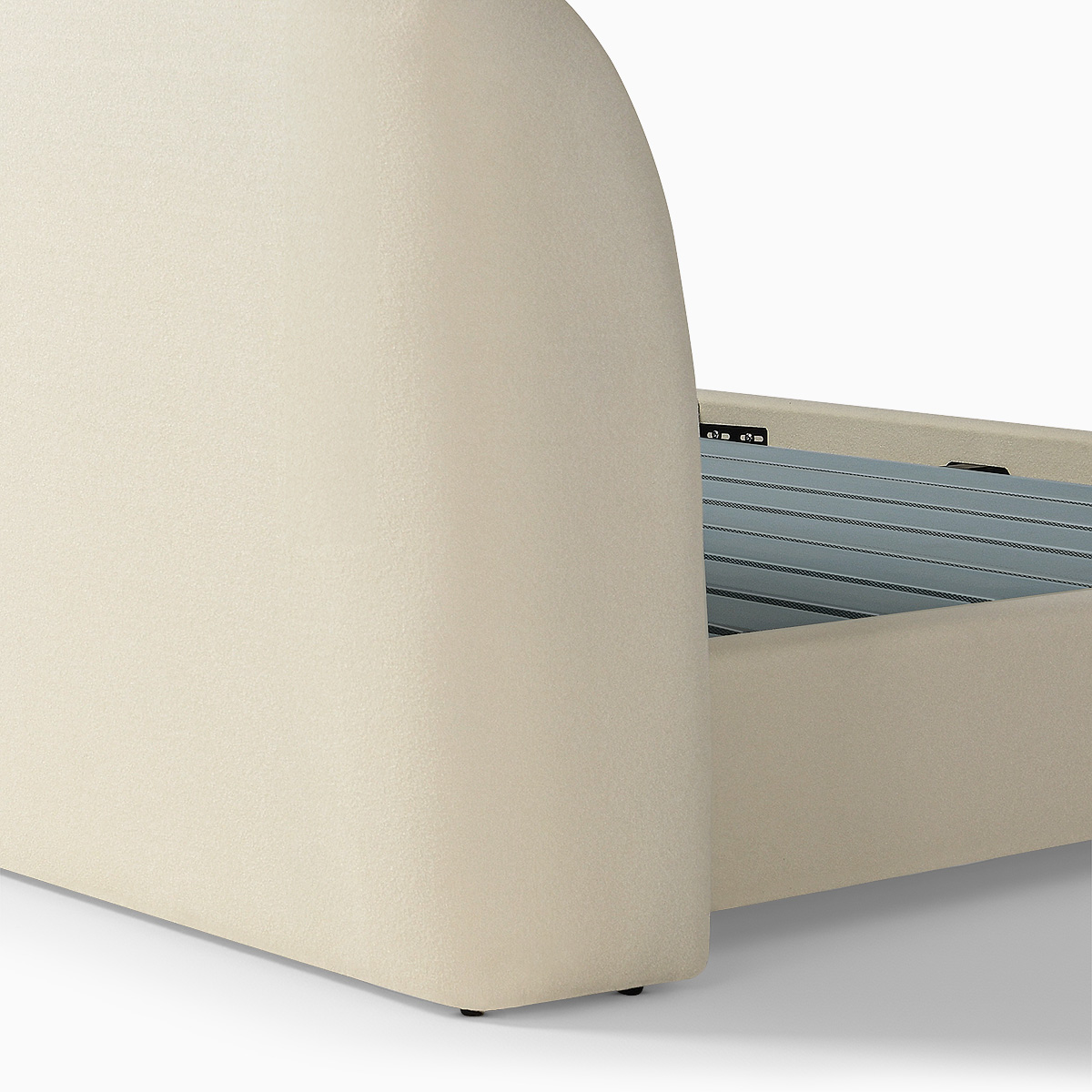 Elevate your bedroom with the Lana bouclé bed, featuring plush white bouclé fabric and a modern, ergonomic design. Its gently curved, sheltered headboard and padded platform, crafted with a sustainable plywood frame, offer both comfort and style for a serene retreat. Perfect for a cozy, contemporary sleep space.color:Off-white, frame material:Plywood, bed size:Queen Size, upholstery material:Bouclé, headboard filling:Foam, frame material:Carbon Steel