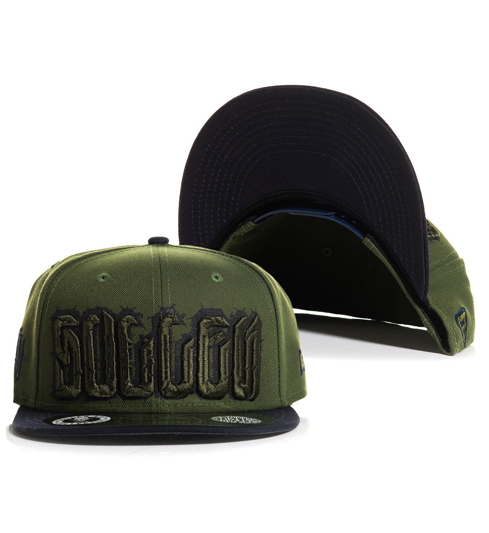 The “Peku Letterhead” features a black and navy-on-olive colorway, that comes with custom, front-of-hat puff lettering. In addition, the Peku Letterhead features its own special branding tag on the inside band!