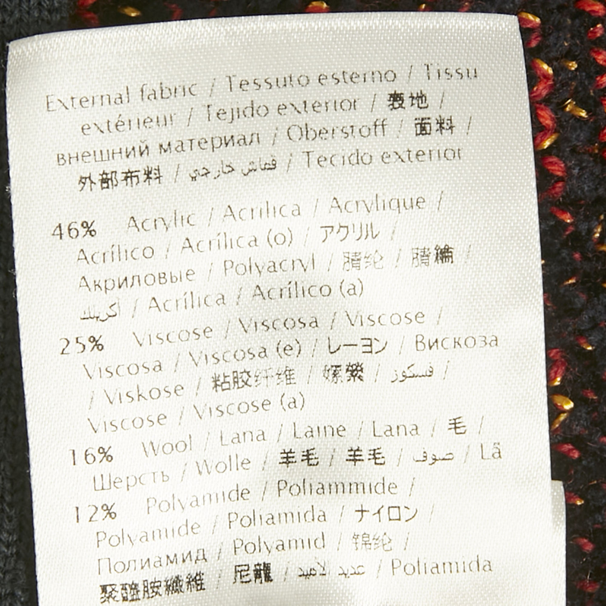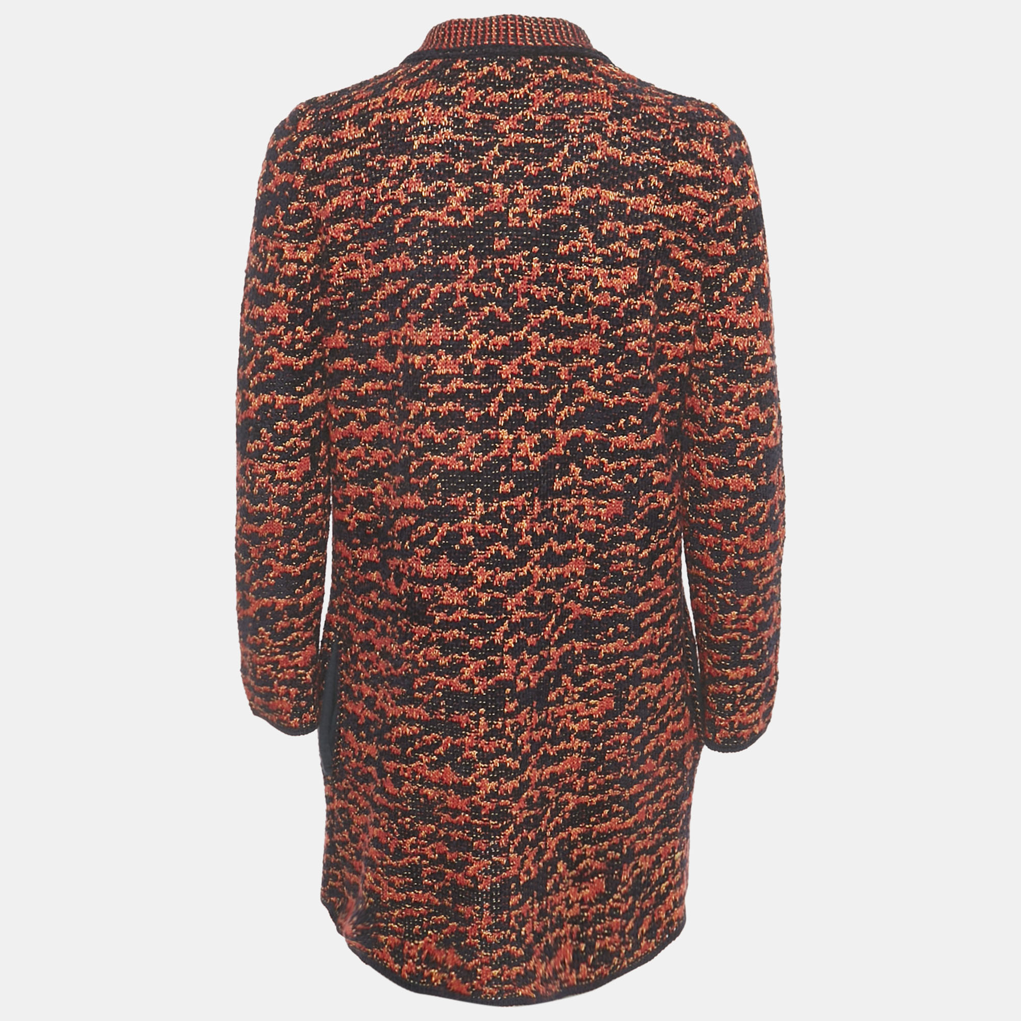 M Missoni’s coat pairs navy and red yarns in a textured knit. The longline cut and understated finish let the colourwork take focus. Signature patterning for effortless outerwear.