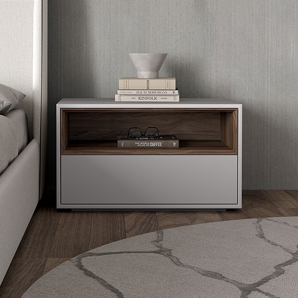 Add contemporary elegance to your bedroom with the Madison Collection. The simple yet striking design complements many interiors, with distinctive lacquer and wood finishes to mix and match for a custom feel. The oversized single-drawer nightstand features standard drawer with push-latch soft closure. An accent compartment creates an organic and copacetic look with our other bedroom pieces.