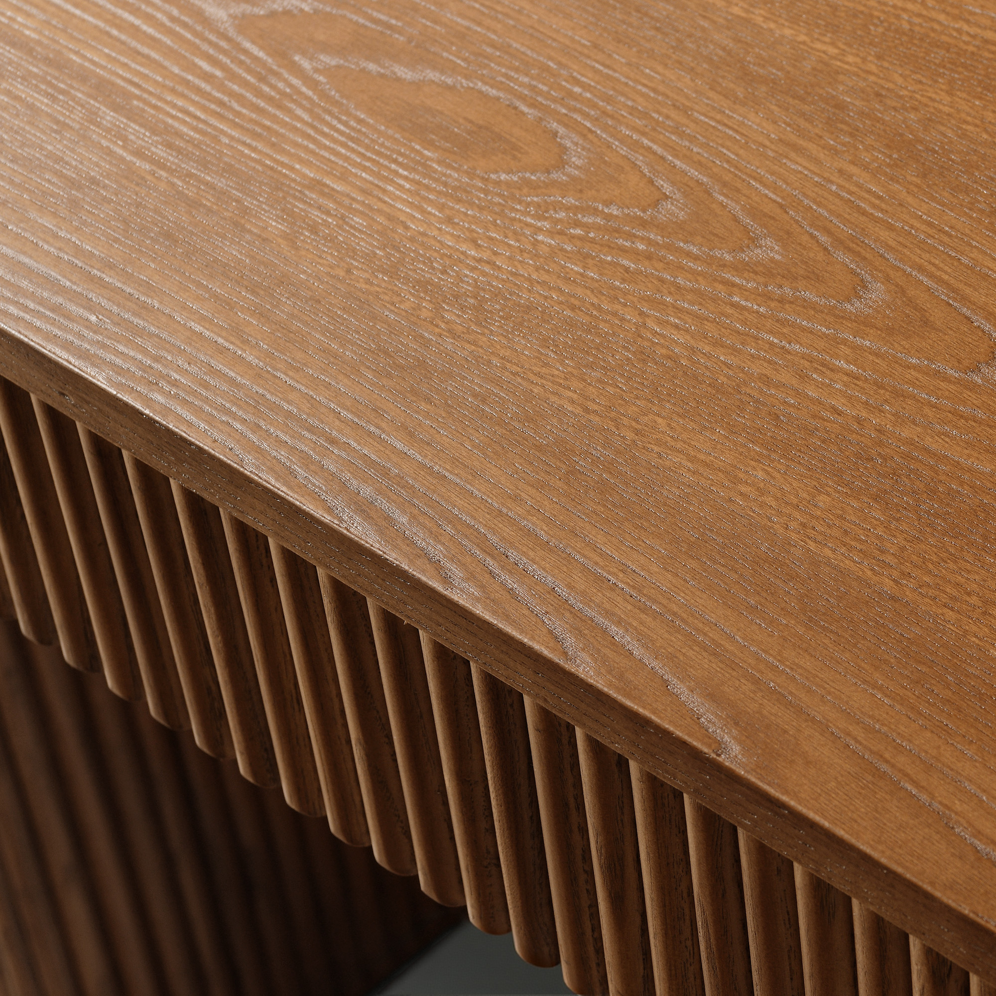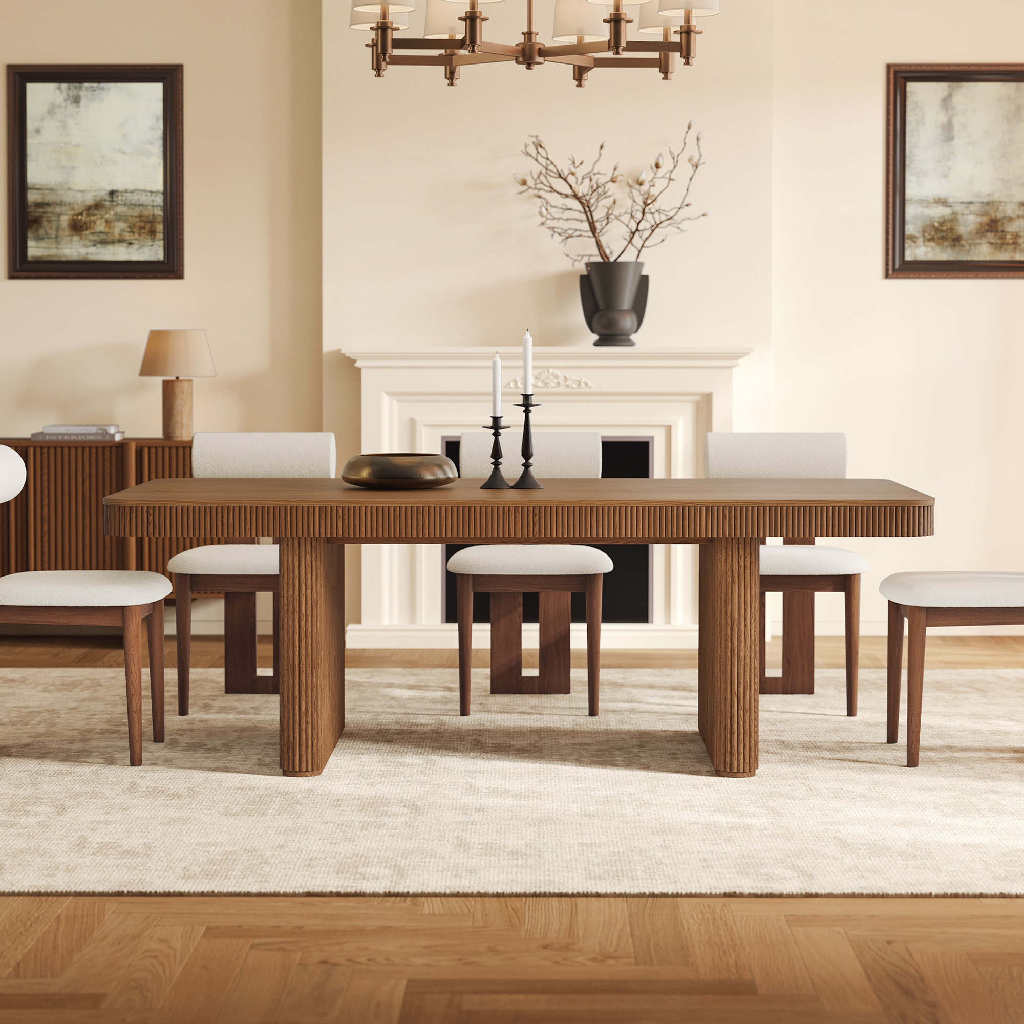 A contemporary and stylish Marisol dining table designed to comfortably seat six people. Vertical fluting pedestal creates a unique texture and adds a sophisticated look. The natural brown wood finish enhances its organic appeal, making it a versatile piece that can complement a variety of interior design styles.color:Brown, shape:Rectangular, tabletop material:Plywood, base material:Plywood, base material:Solid Wood, finish:Elm Veneer, seating capacity:4-6