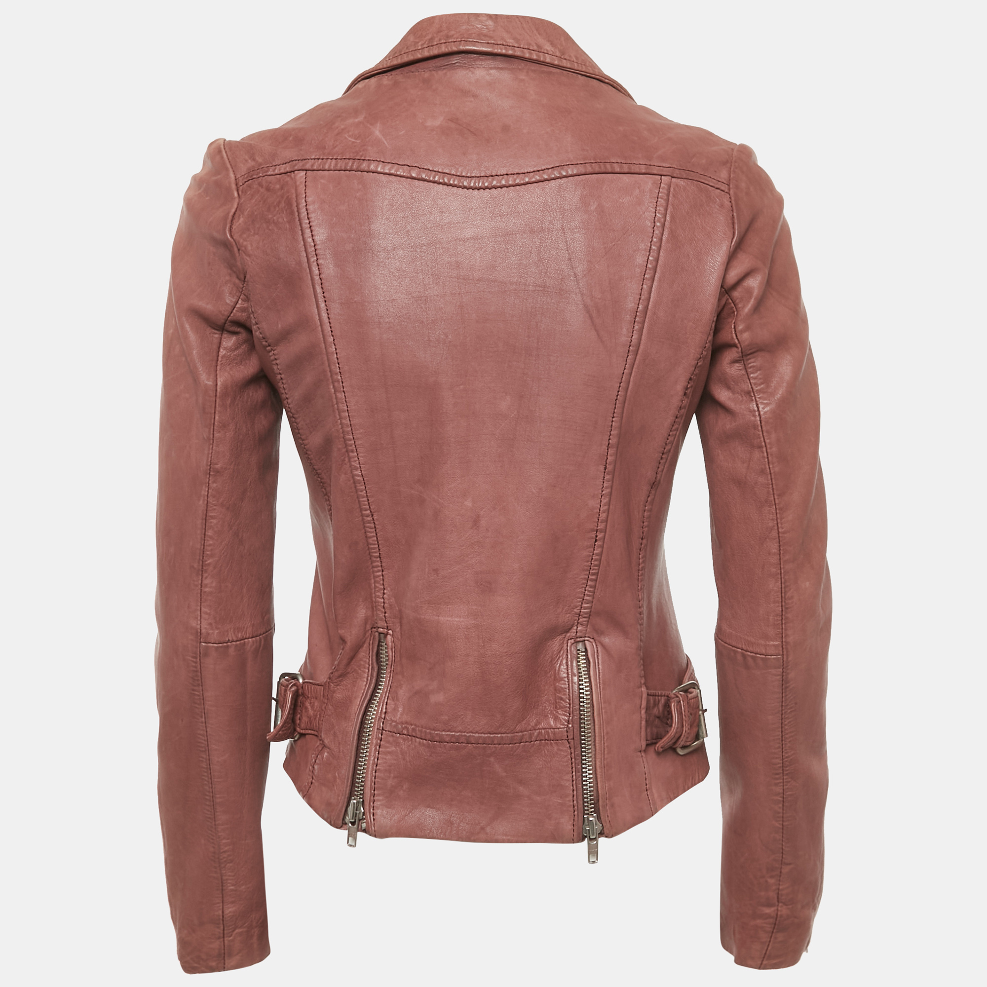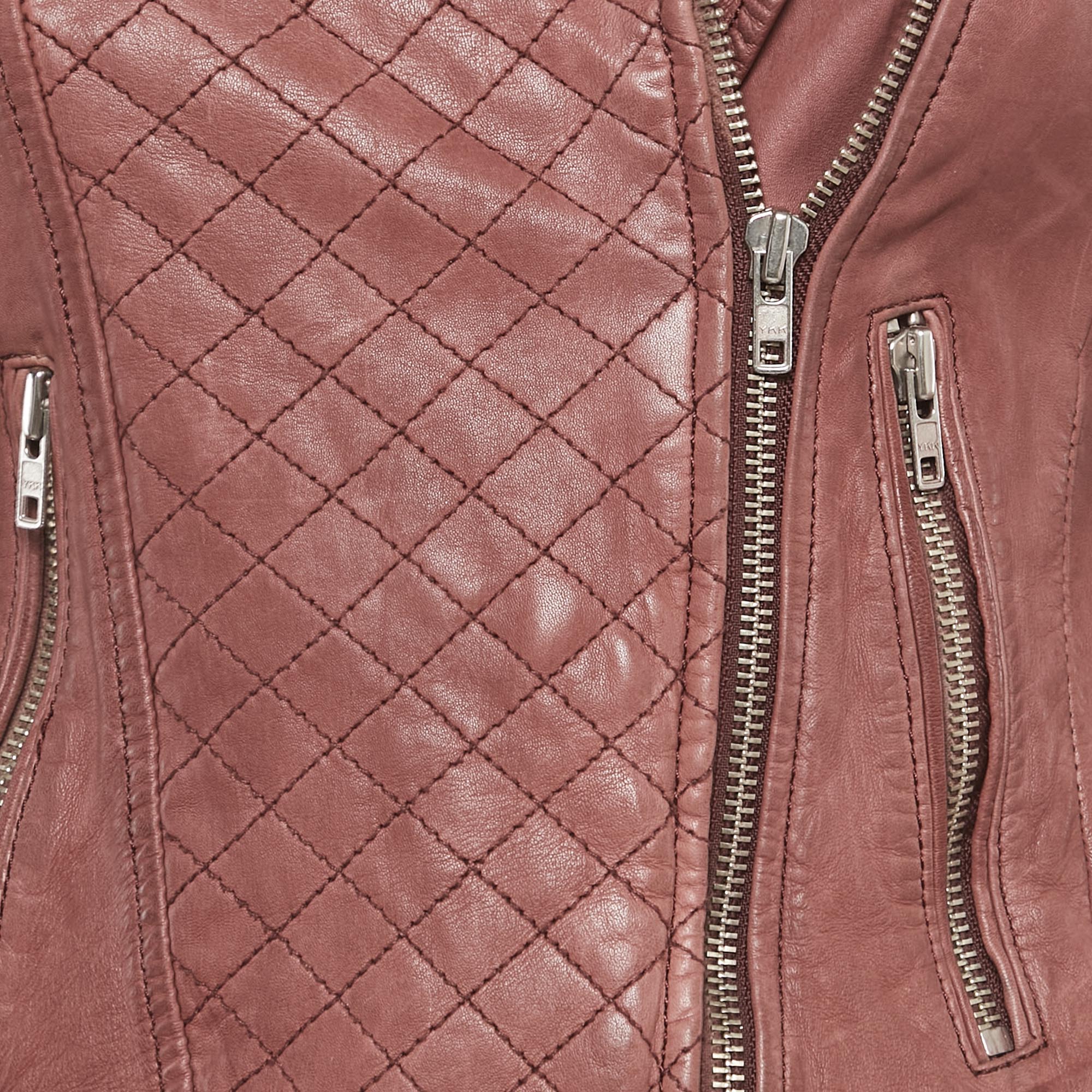 Maje’s bomber jacket gets an update in soft onion pink leather with quilted detailing. Complete with zippers and buckles, it’s a layering piece that transitions seamlessly between casual and dressed up looks.