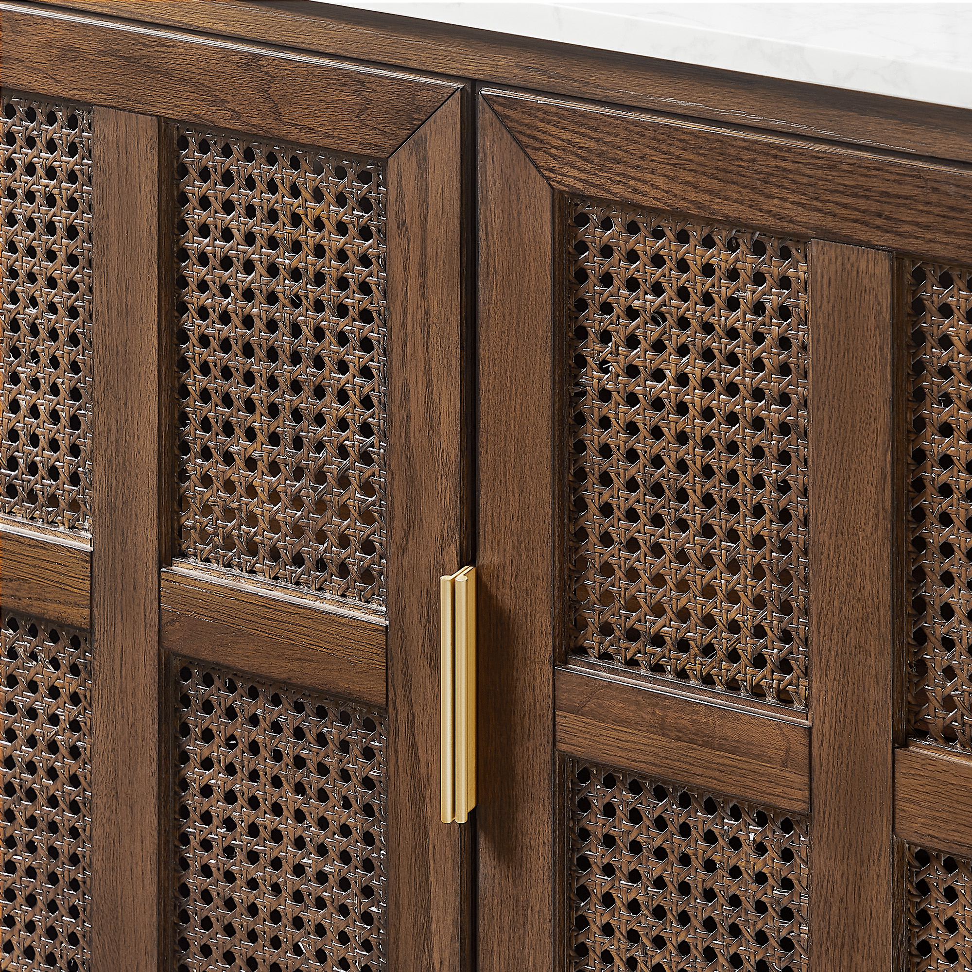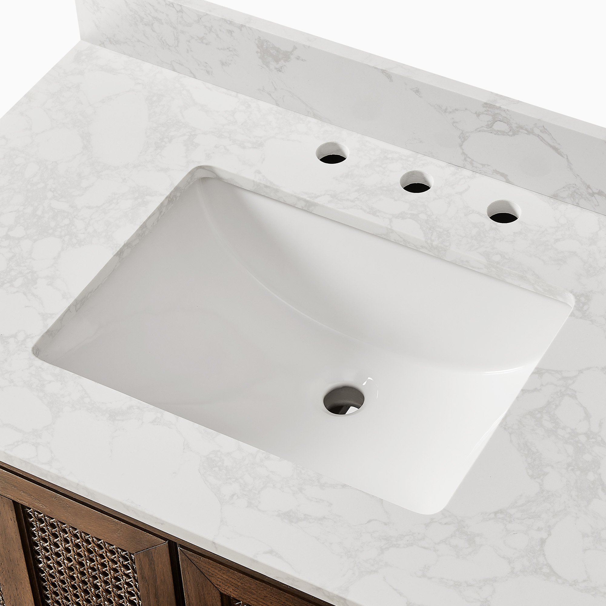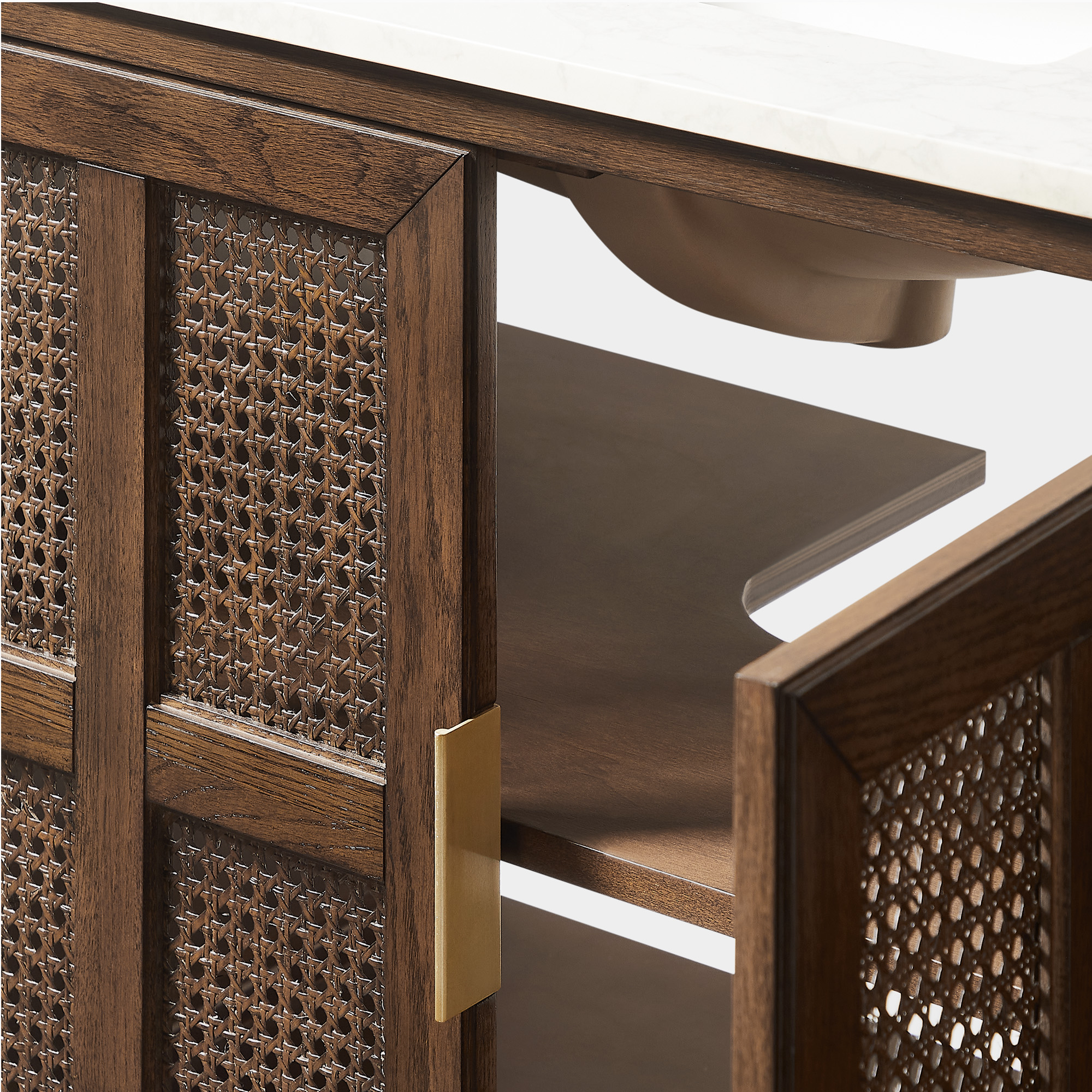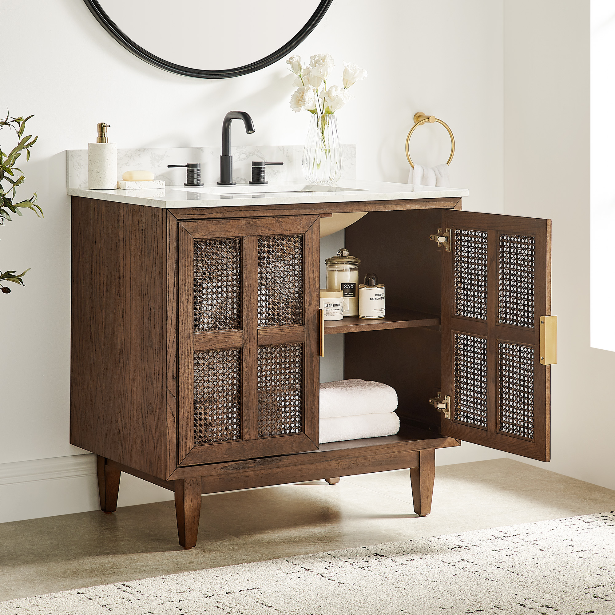 Elevate your solid wood bathroom vanity with this charming single bathroom vanity with sink. Featuring unique natural rattan doors, ample storage, and a pristine white marble top for timeless style.color:Brown, material:Marble, material:Solid Wood, material:Plywood, finish:Oak Veneer, feature:Adjustable Shelves, number of shelves:2, number of sinks:Single, faucet included:No, material:Natural Rattan