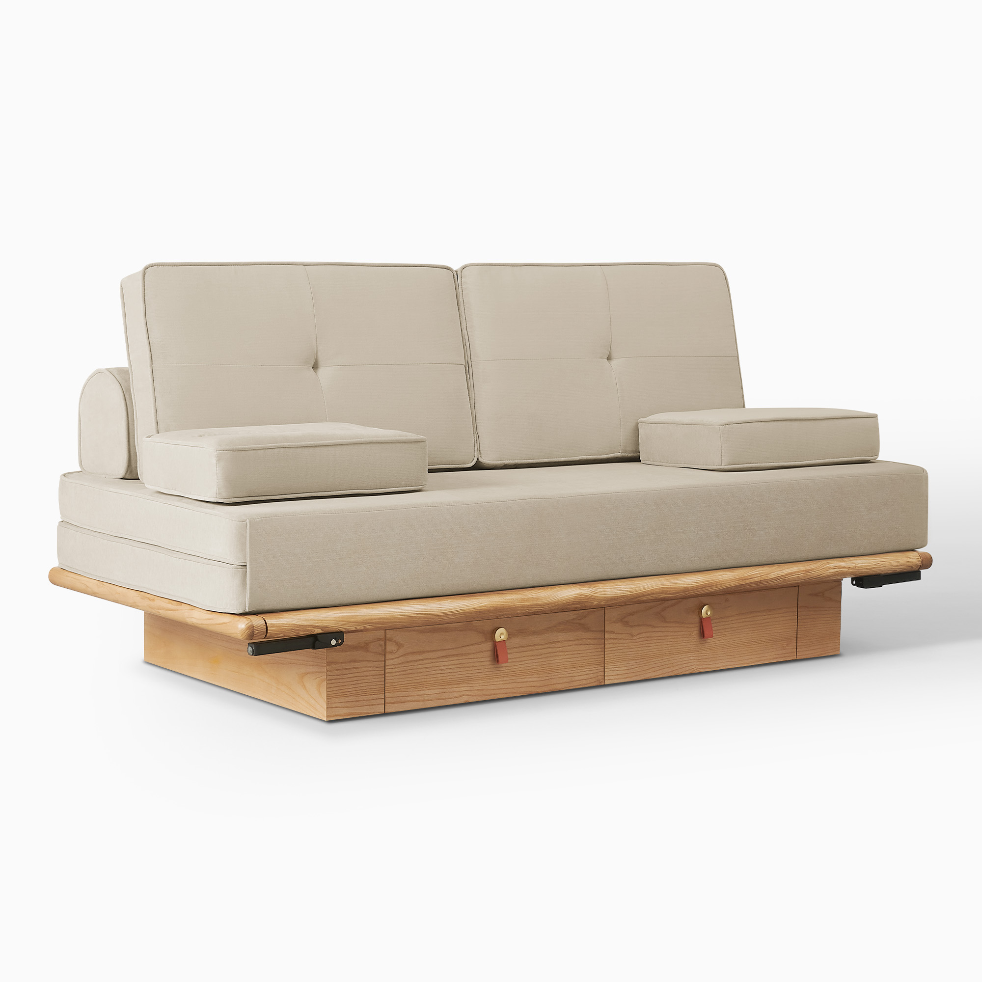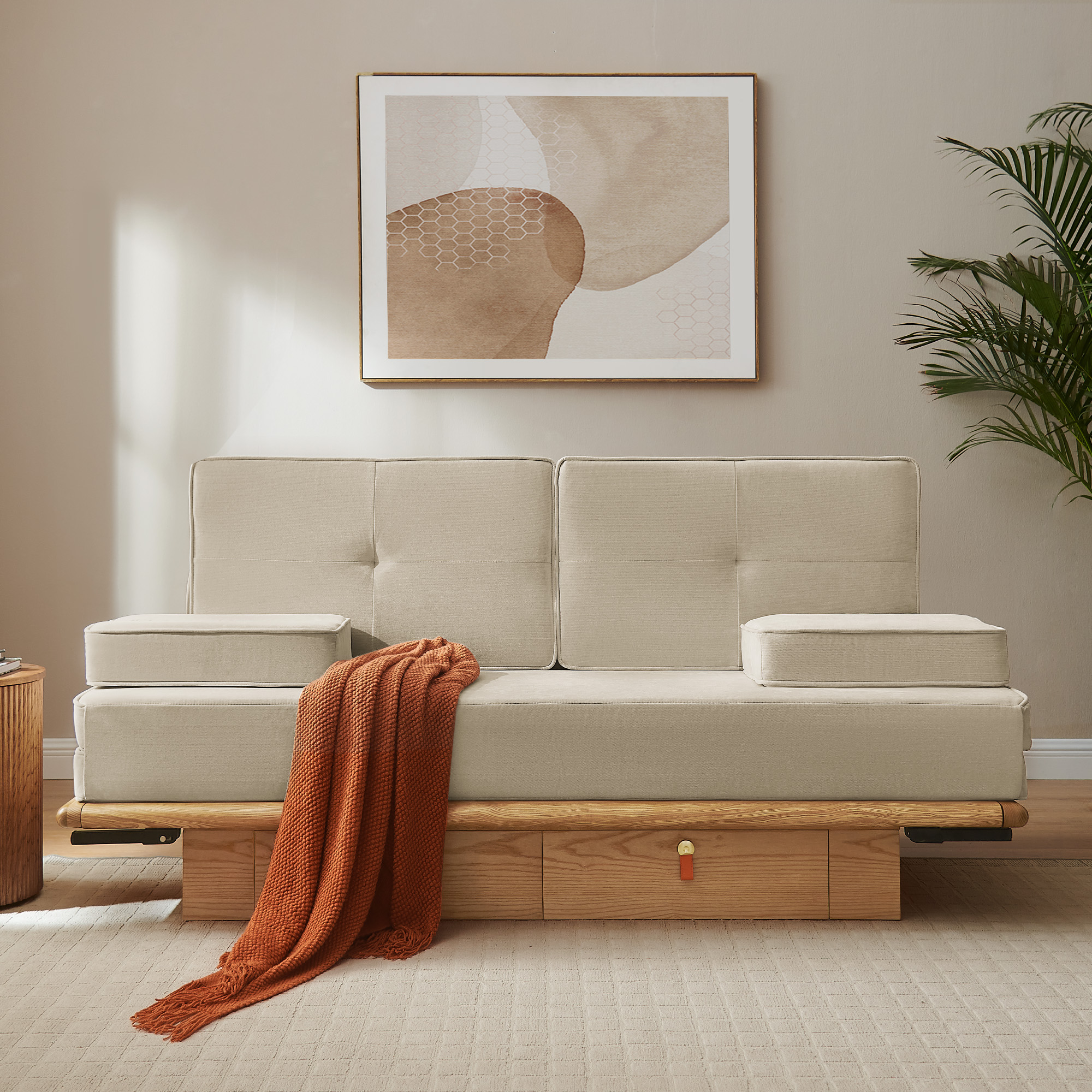 The 78 inch solid wood sofa bed has breathable cotton linen upholstery for maximum comfort. The sturdy solid wood frame ensures lasting stability. Convenient under-seat drawers provide practical storage.number of drawers:2, style:Modern, max bearing weight:600 lbs, color:Beige, sofa type:Sofa Bed, color:Natural, seating capacity:2-4, frame material:Ash Wood, frame material:Plywood, filling:Foam, upholstery material:Cotton Linen