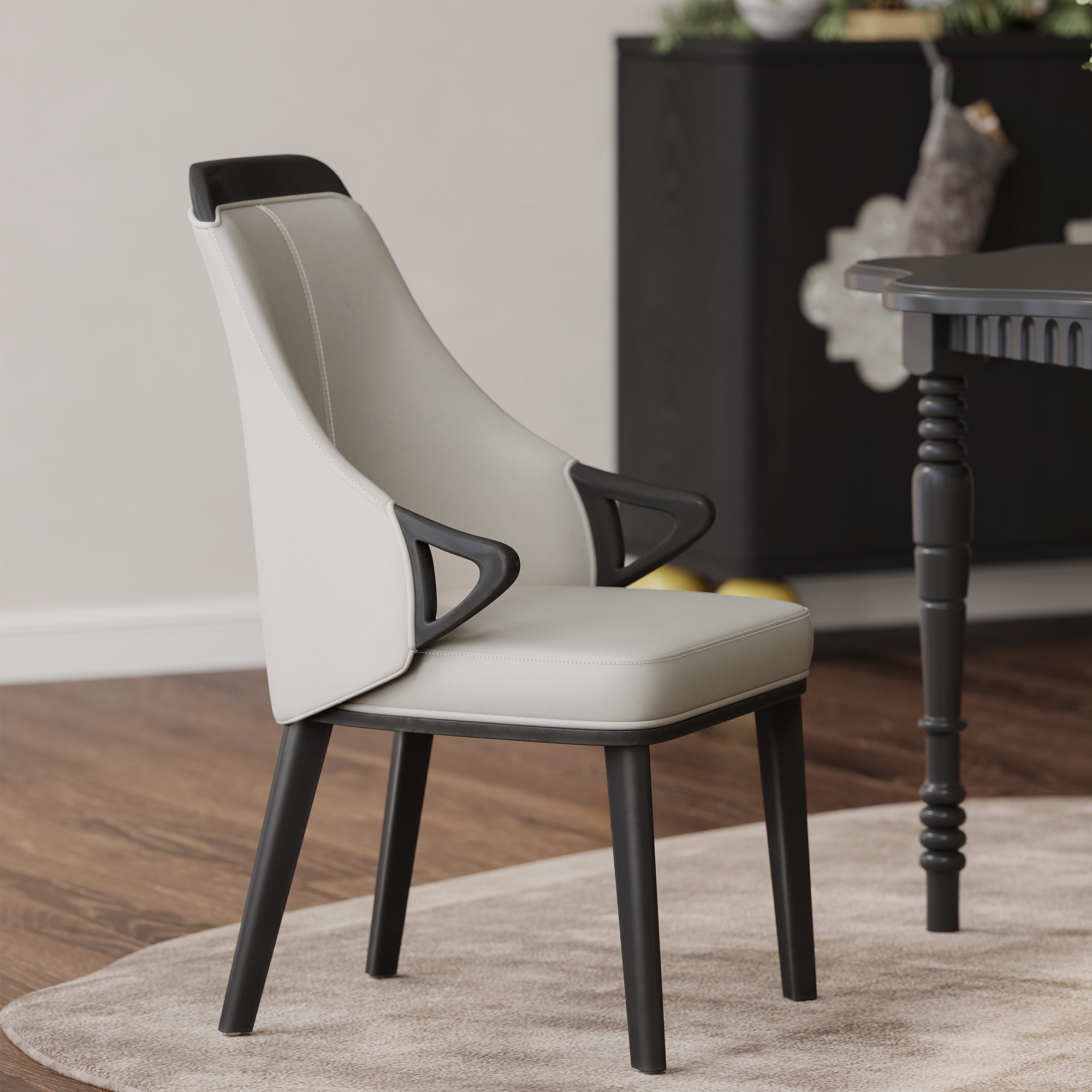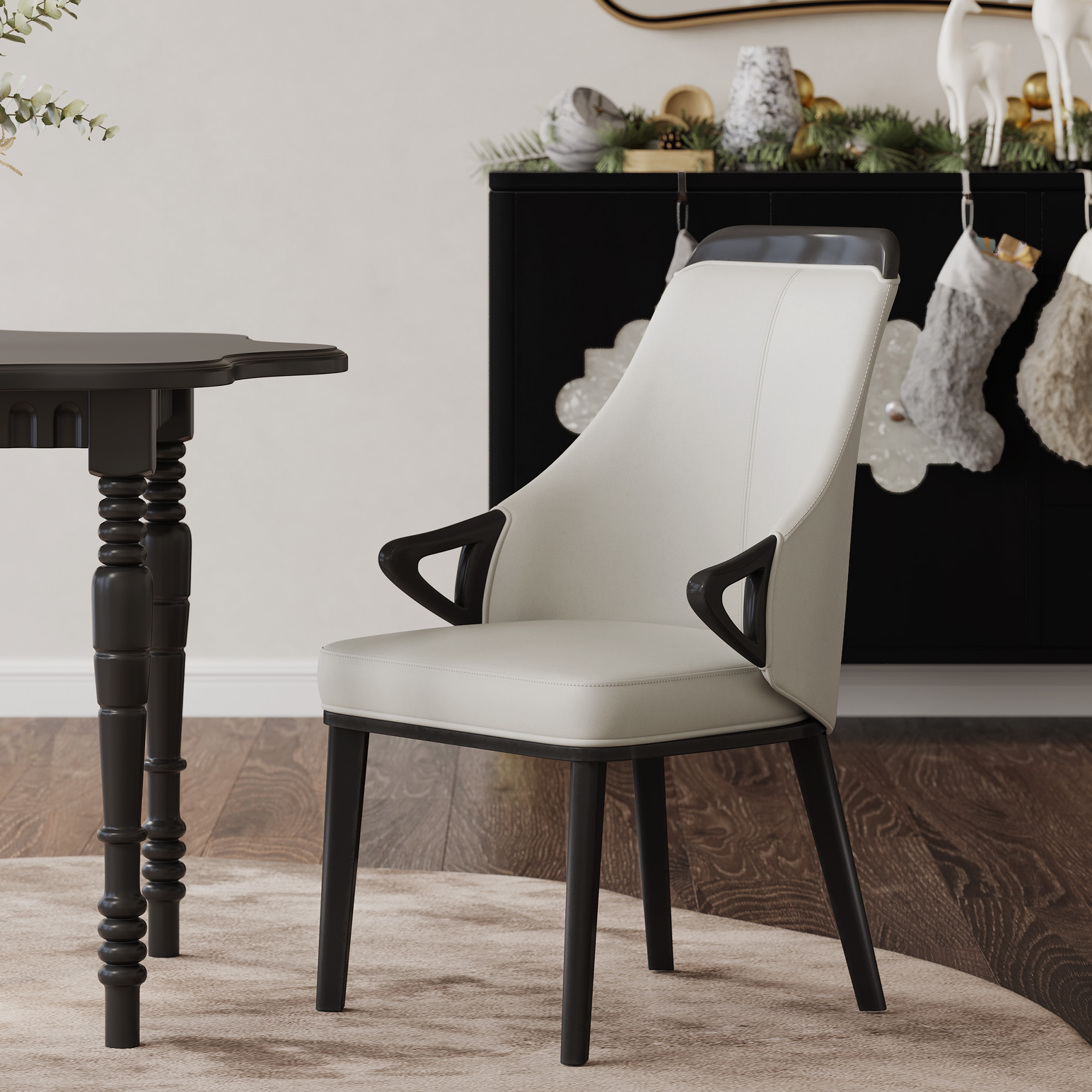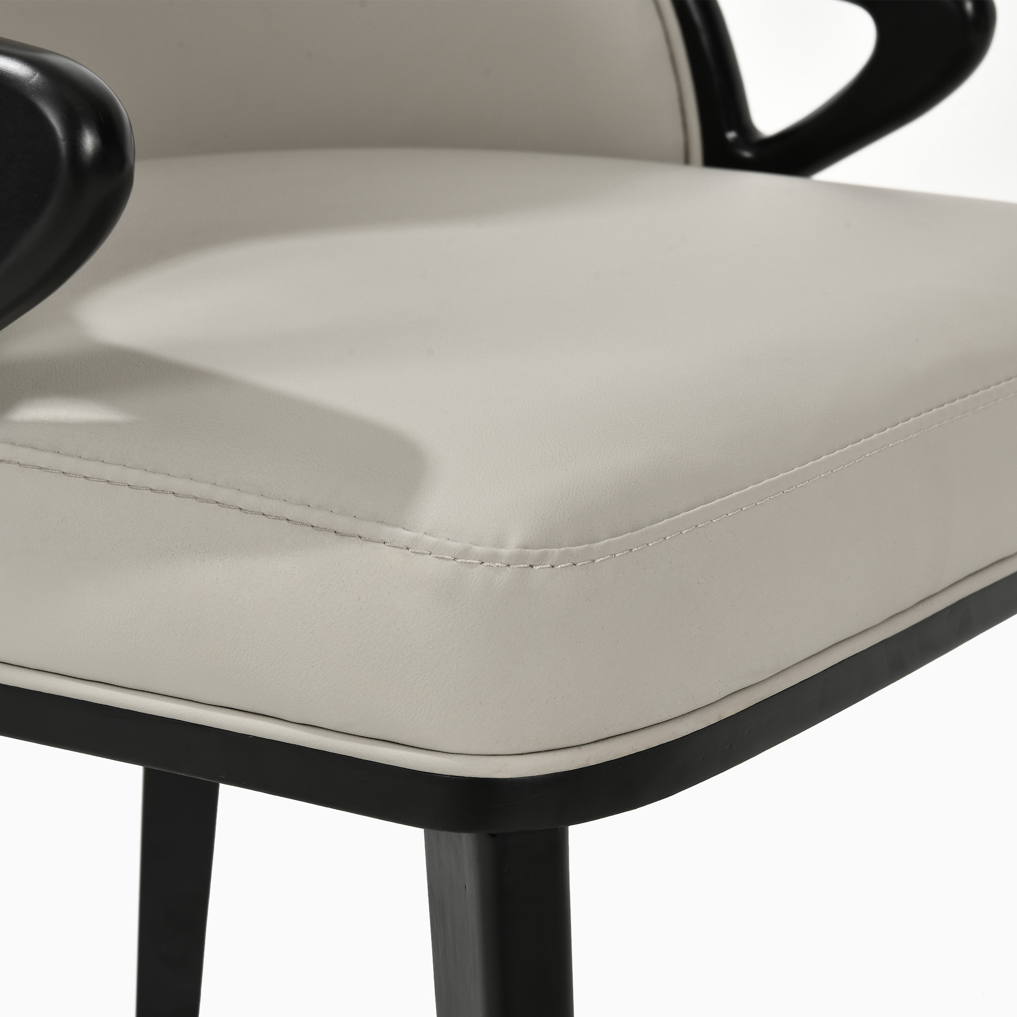 Such black and white dining chairs will be the embodiment of stylish design, adding a chic and practical element to any home. In a stylish two-tone faux leather combination, the upholstered seat and back are embellished, mounted on black solid ash wood legs for a stable, fully supportive structure.color:Black, upholstery material:PU Leather, back design:Full Back, unit count:2 PCS, frame material:Ash Wood, filling:Foam, armrest design:With Armrest, max bearing weight:330 lbs, color:Light Gray