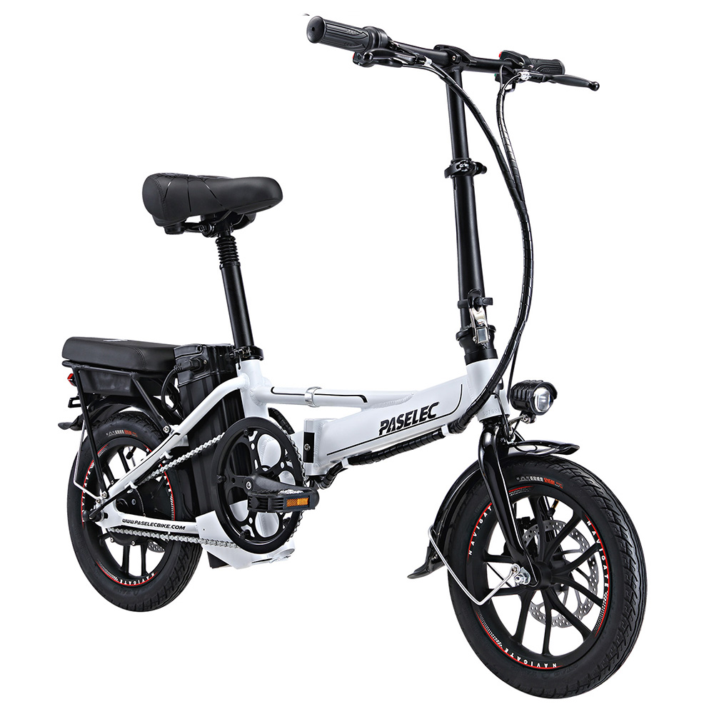 PASELEC Mini Folding Electric Bike 400W Motor 48V 13AH Battery 14*1.95-inch Tire 40km/h Max Speed 60km Range Mechanical Disc Brakes Aluminum Alloy Front Fork LED Display – White