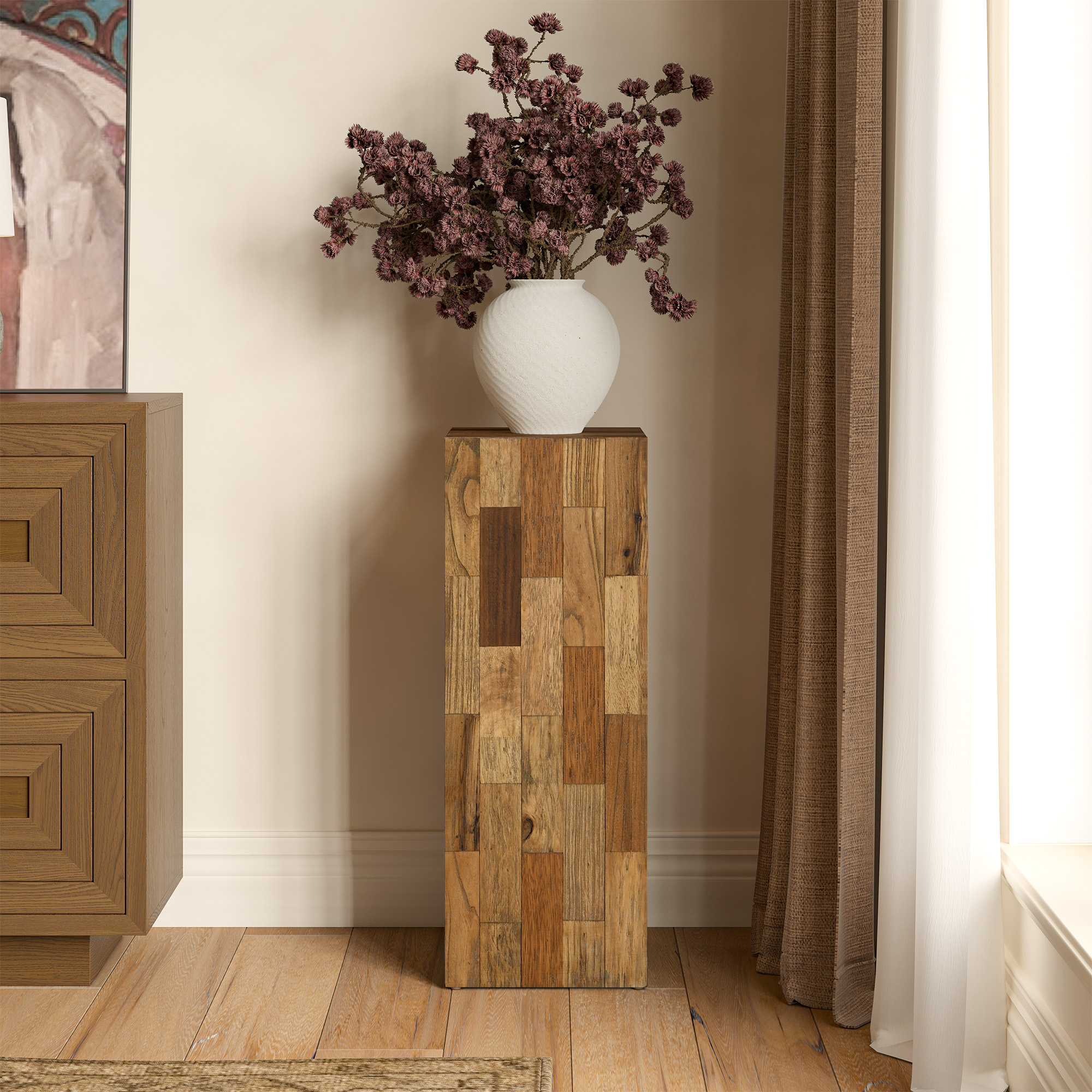 Discover this artisanal tall old elm side table featuring a striking mosaic of natural wood tones and organic grain. Crafted with precision joinery, its minimalist square silhouette blends rustic charm and contemporary design.color:Natural, shape:Rectangular, finish:Old Elm, tabletop material:Old Elm, base material:Old Elm