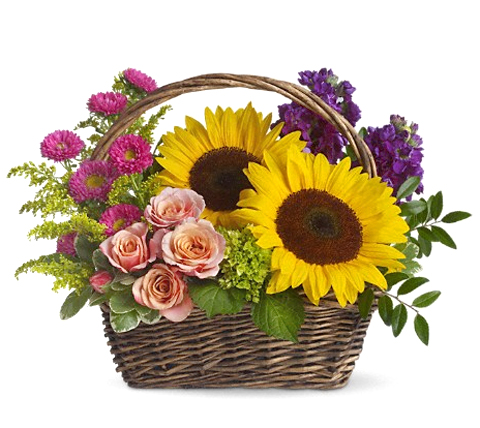 Celebrate any summer occasion or gathering with this festive bouquet of fresh sunflowers, miniature roses, asters, stock, or similar garden-fresh fresh favorites designed and delivered in a natural woven basket. Delightful! Available in most areas from late May through September. Approximately 10 to 12 inches in height. Florist delivery in the USA and Canada.