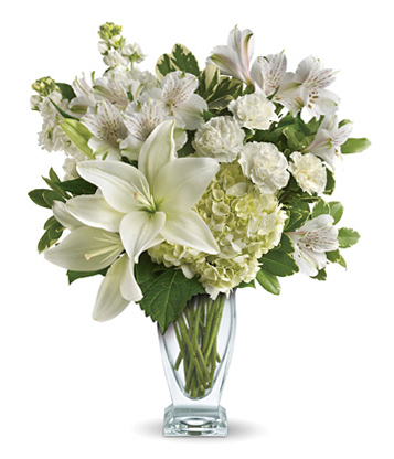 A tasteful design of elegant white flowers, such as lilies, hydrangea, alstroemeria, or similar fresh blooms, designed and delivered in a clear glass vase. Simple, stylish, and beautiful. Florist delivery in the USA and Canada.