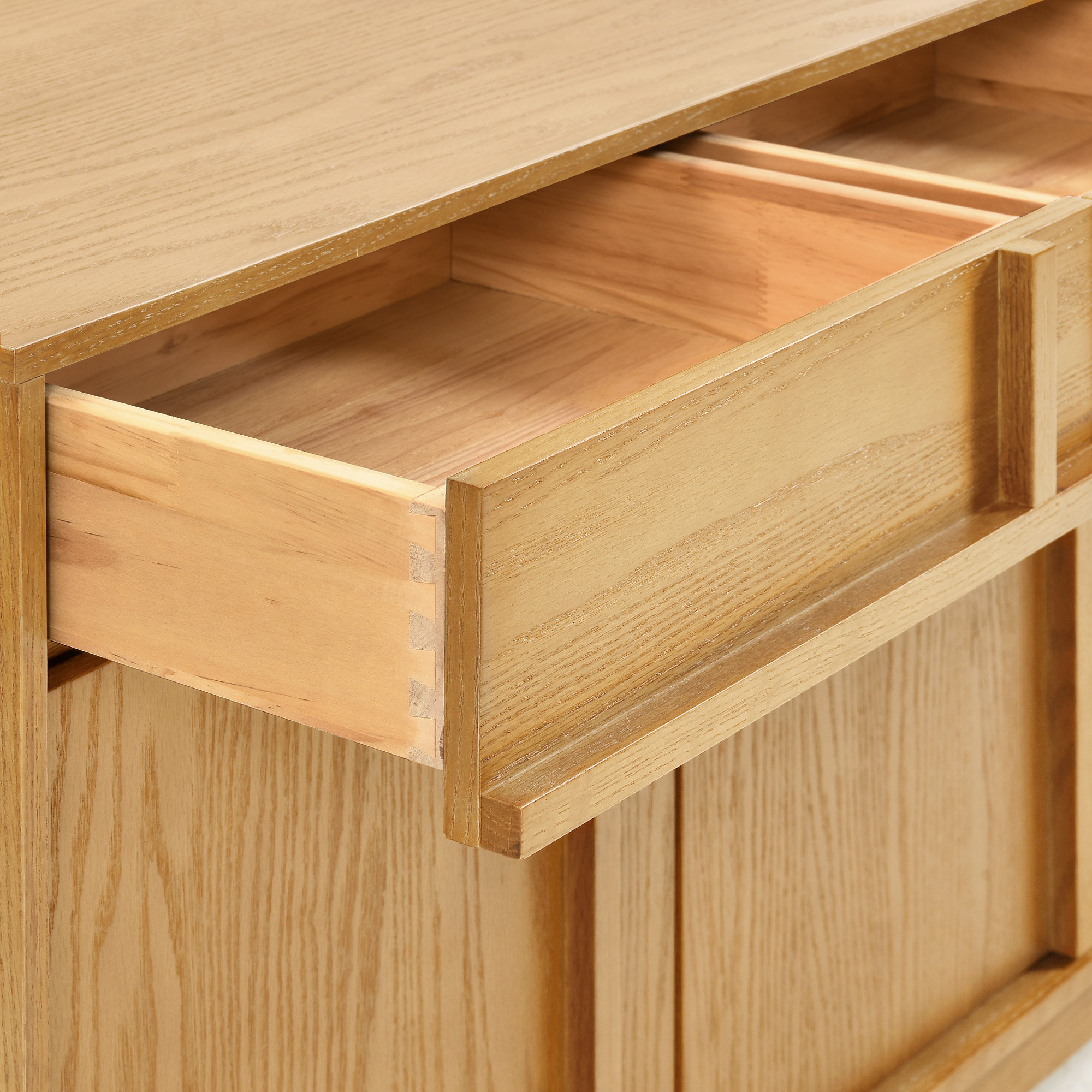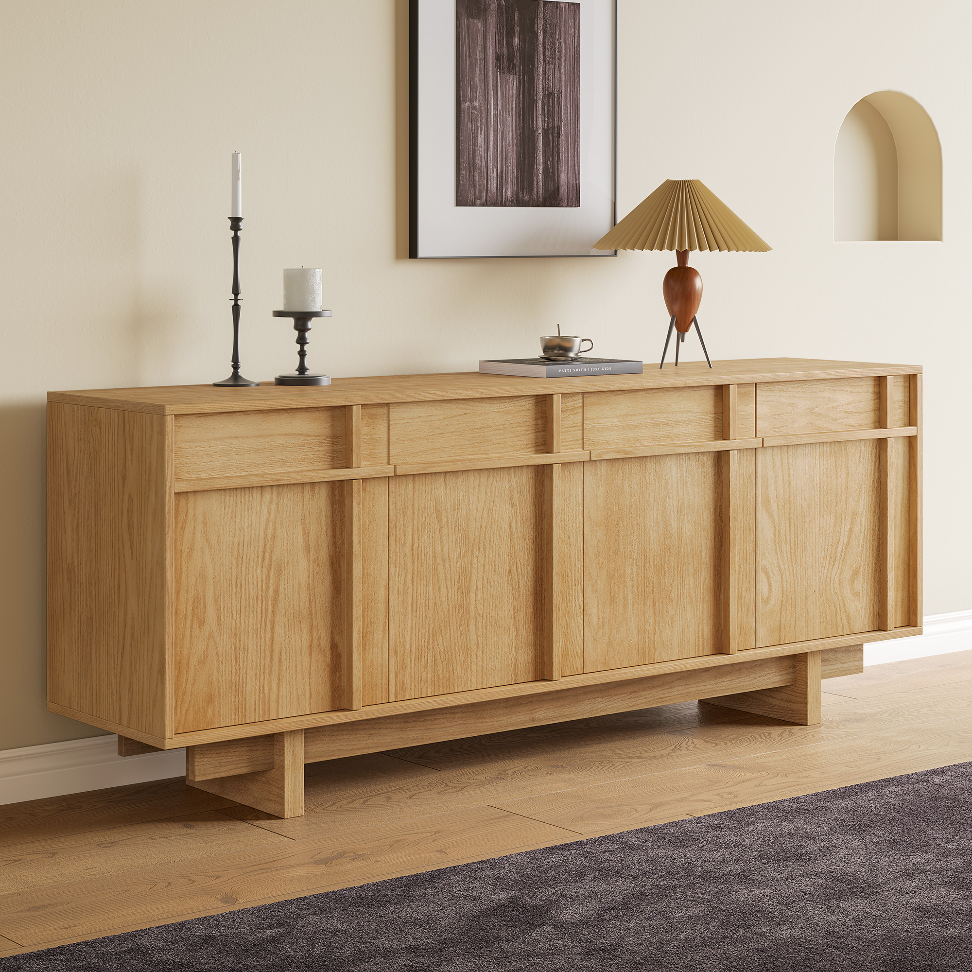 The Ragnar 71″ sideboard, crafted from natural ash wood, features clean, fluid lines, reinforced horizontal bars, and legs, providing structural integrity while echoing a retro style. Credenza has 4 dovetailed drawers and 2 cabinets with adjustable shelves, offering generous storage capacity. color:Natural, sideboard type:Sideboard, material:Ash Wood, material:Plywood, number of drawers:4, door mechanism:Push-to-open Door, door mechanism:Pull-to-open Door, drawer mechanism:Pull-to- open Drawer, finish:Oak Veneer, number of shelves:6