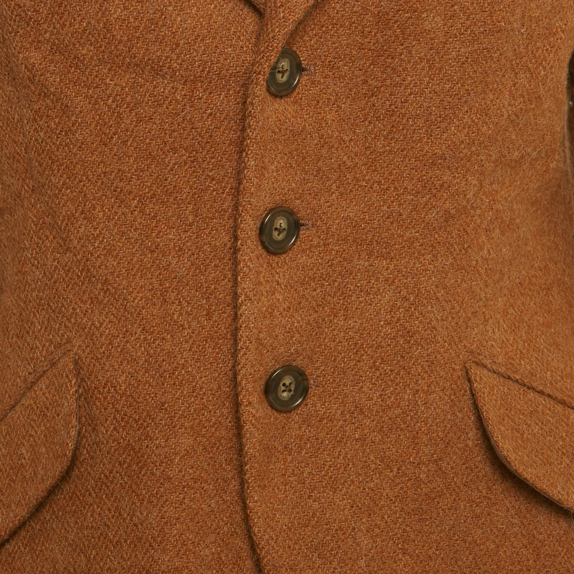 This preloved Ralph Lauren blazer is tailored from a brown wool blend with a three button front and classic lapels. Shaped at the waist and finished with flap pockets, it recalls traditional riding styles with a modern bearing.