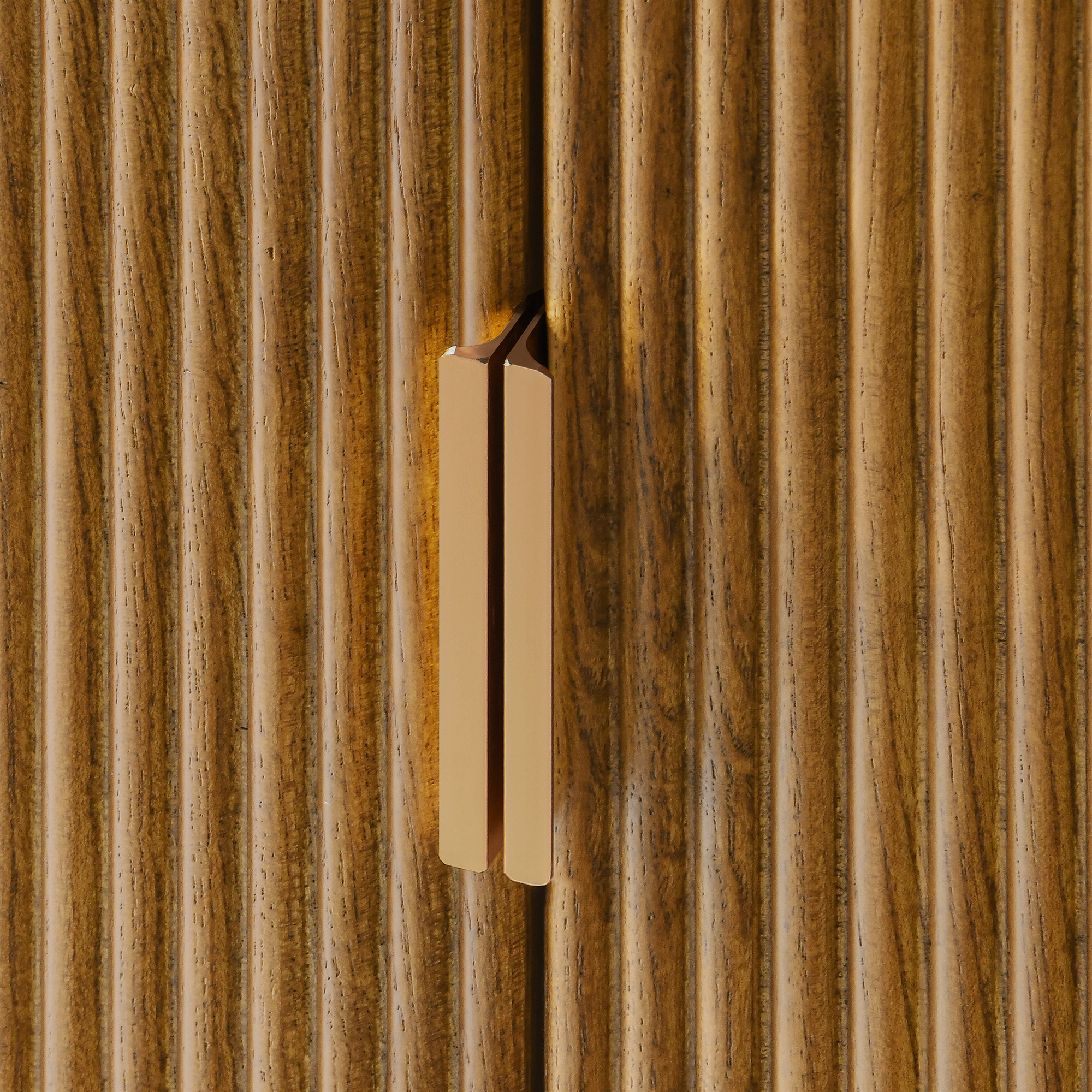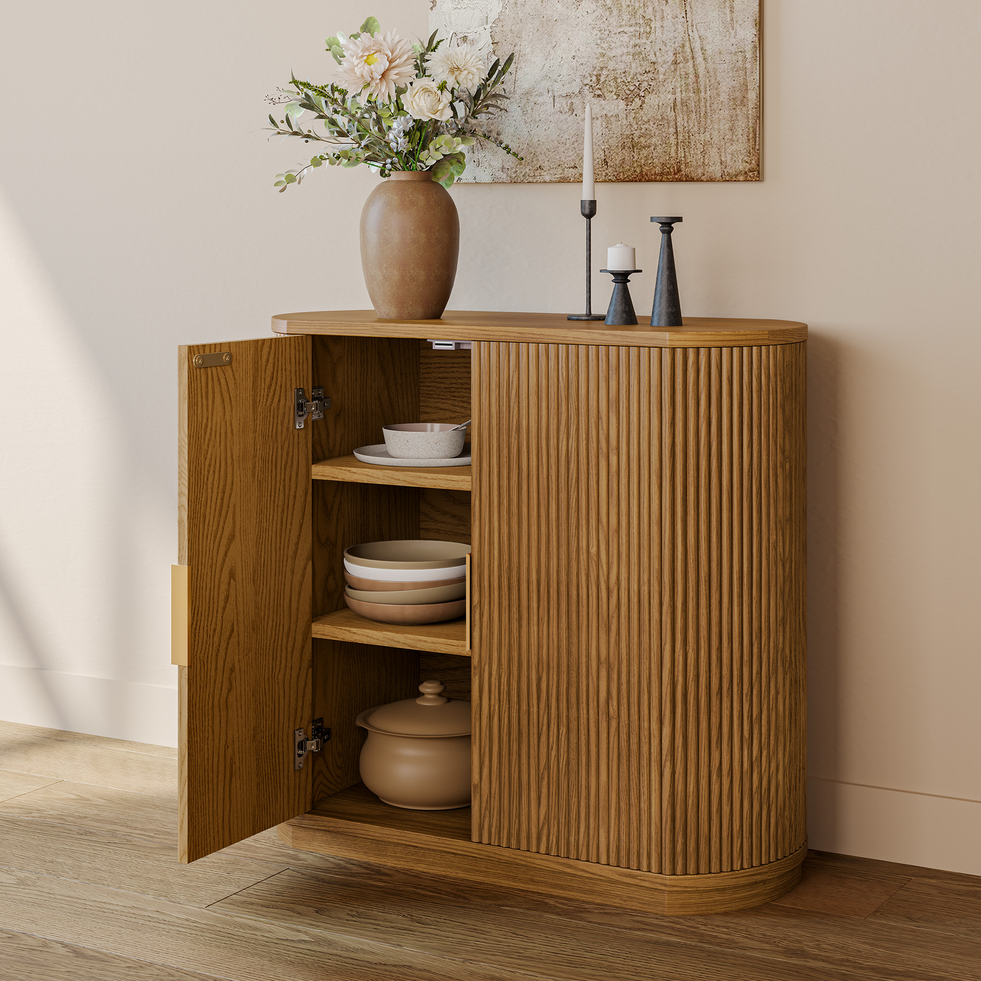 Charming small cabinet with a stylish solid wood fluted door design. Offers compact yet ample storage for any room. Its elegant and space-saving form adds a touch of sophistication.color:Natural, number of shelves:2, material:Plywood, material:Solid Wood, finish:Ash Wood Veneer