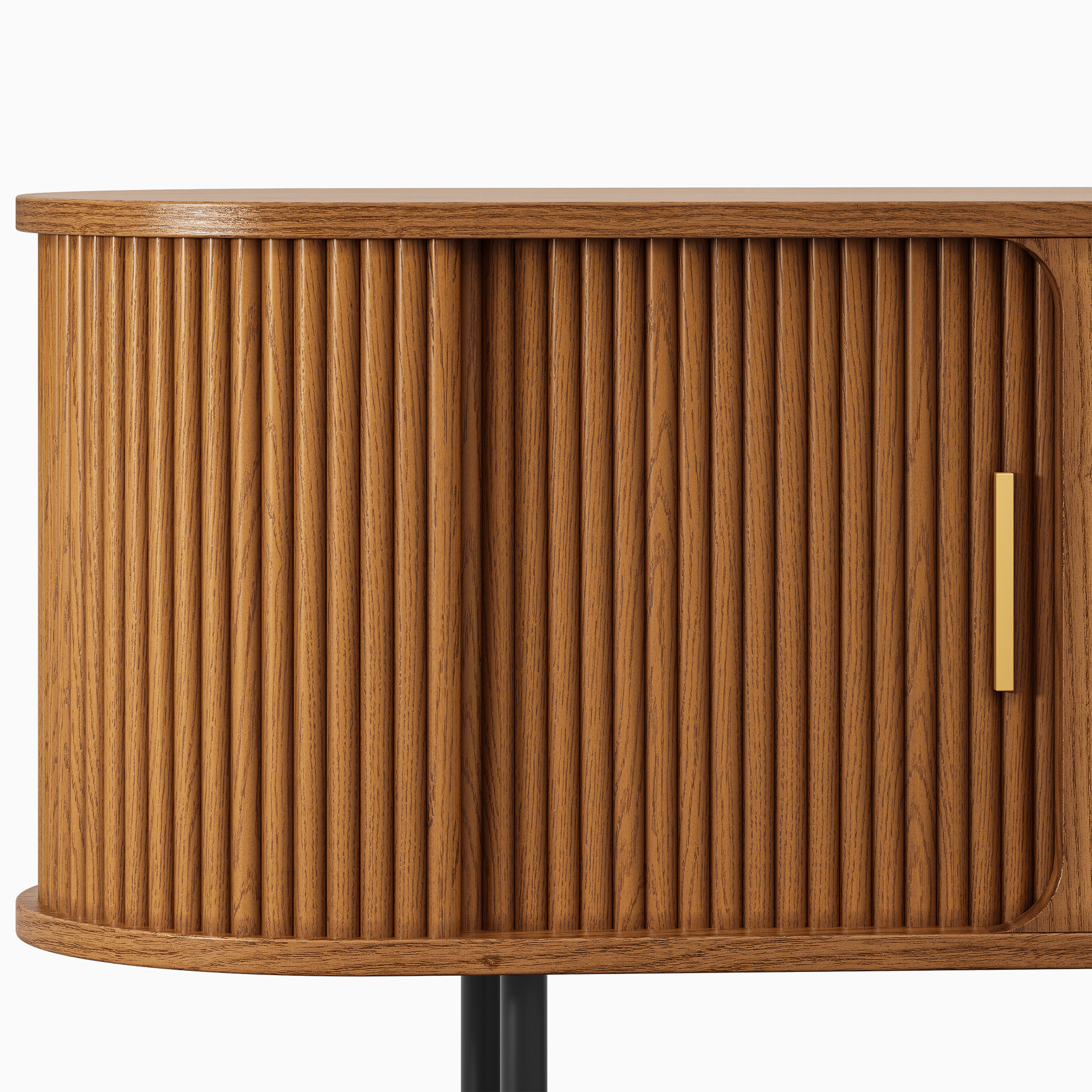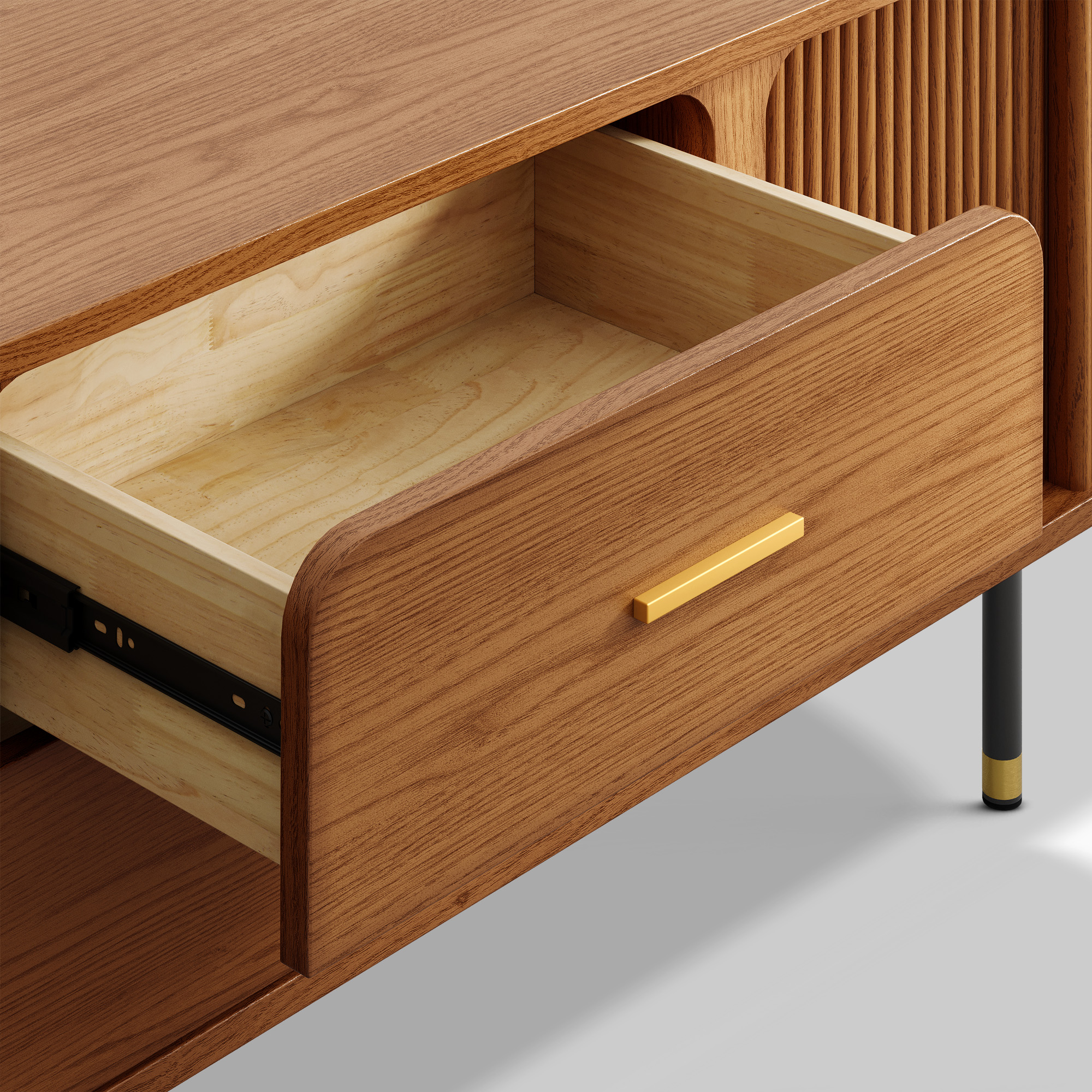 Discover our Rolf 70″ oval solid wood TV Stand with tambour door and drawers. Boasting a beautiful ash wood veneer, tall-cast metal legs and a roller shutter door. Whether it is set in your living room or entertainment room, this media console will be the highlight of your home decor.applicable tv size:Up to 75″, material:Plywood, finish:Ash Wood Veneer, legs material:Iron, number of drawers:2, door mechanism:Tambour Door, cable management:Yes, material of drawers:Solid Wood, material:Rubber Wood, cabinet door material:Rubber Wood, color:Brown, media console type:Standard