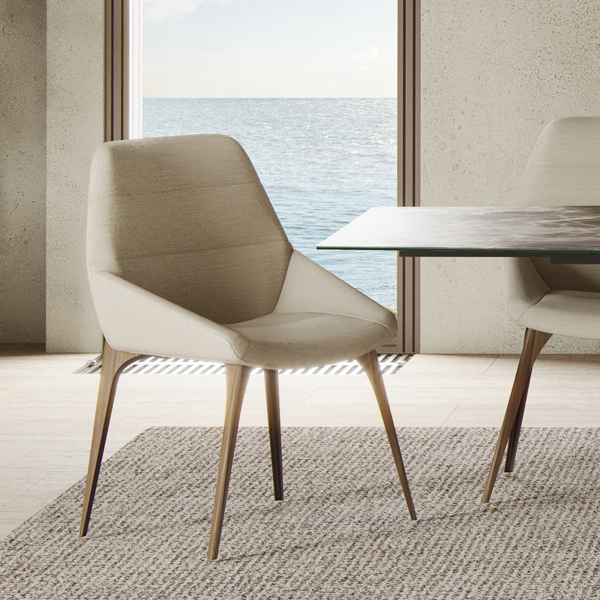 The Rutgers Dining Chair is the perfect seat for design connoisseurs. Line-tufted bucket seats imbue both elegance and comfort, while the sleek dimensions and angled architecture give the Rutgers a modern feel. Below, sturdy yet stylishly thin metal legs are warmly wrapped in premium wood veneers. The inside of each leg is matte-painted, providing just the right amount of juxtaposition to instill timelessness. Commercial grade quality.
