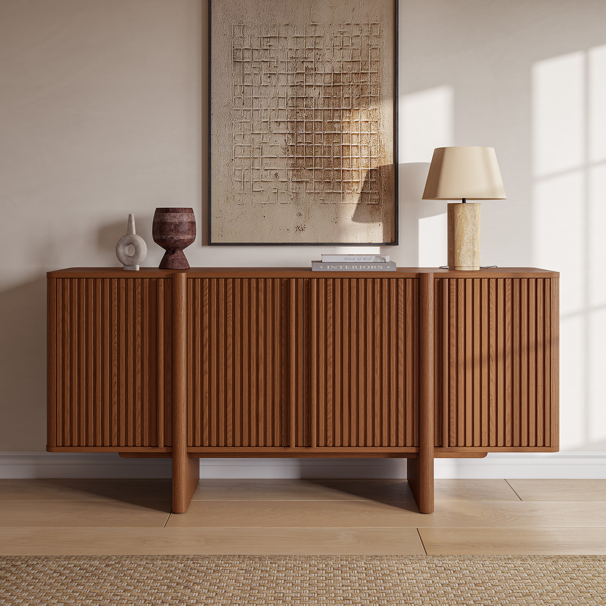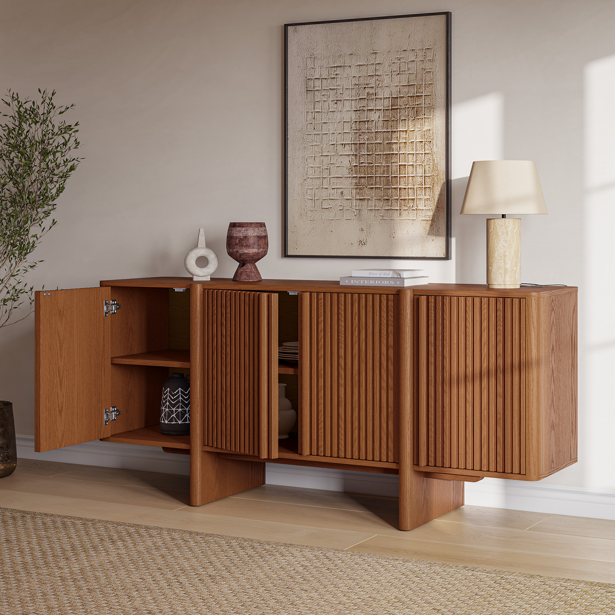 Sabina sideboard featuring ash wood fluting decorative door panel design to enhance the overall dimension and rhythm. With a spacious interior and multiple independent storage compartments, the credenza is ideal for storing tableware, glasses, tablecloths, and various items.sideboard type:Sideboard, material:Plywood, material:Ash Wood, finish:Ash Wood Veneer, number of shelves:6, feature:Adjustable Shelves, color:Reddish Brown