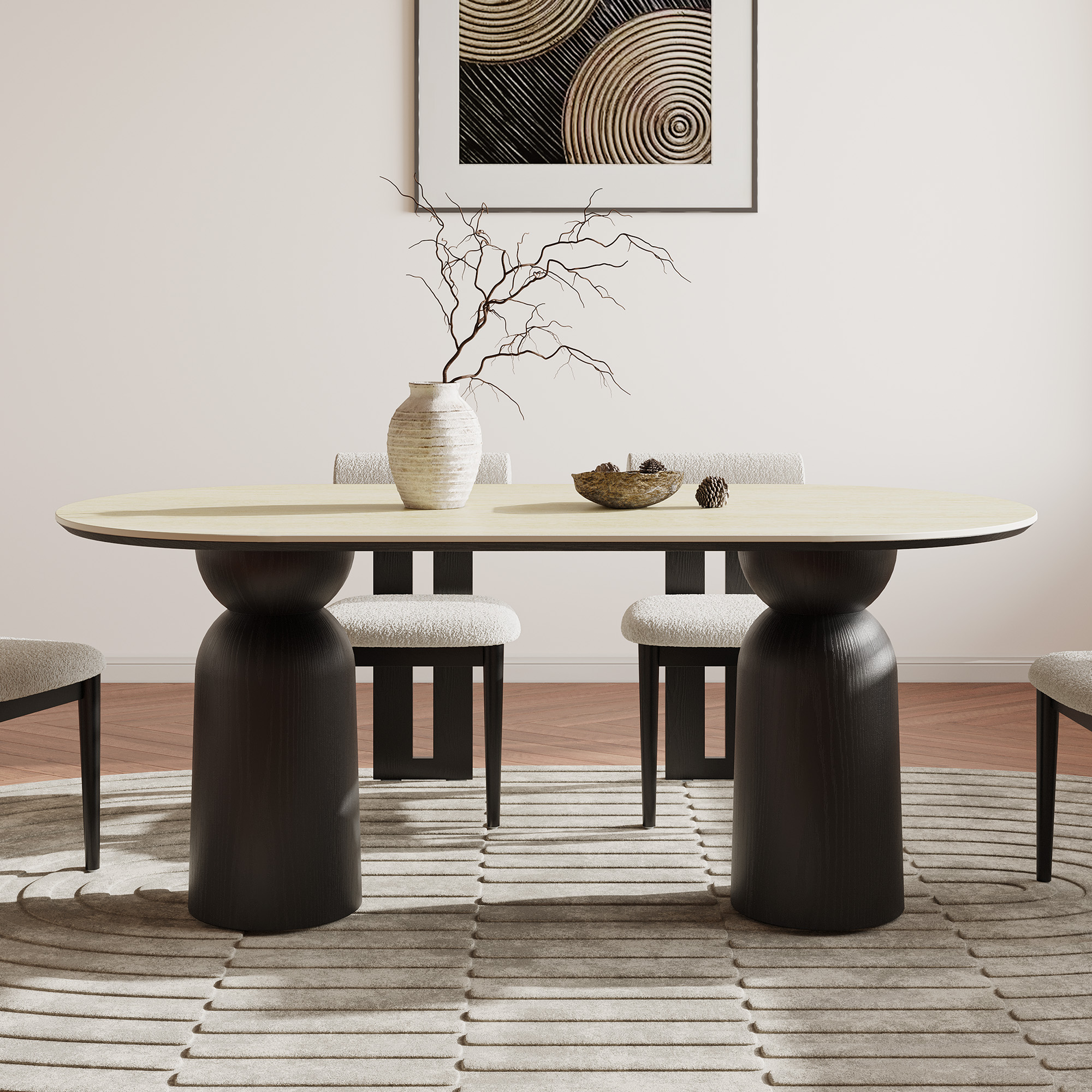 Elevate gatherings with our chic 4 to 6-seat oval 72″ dining table. Its sintered stone top & bold black resin base create a modern, inviting space. Perfect for any style, its smooth lines foster cozy dining. color:Black, shape:Oval, tabletop material:Sintered Stone, seating capacity:4-6, color:Beige, tabletop material:Plywood, base material:Resin