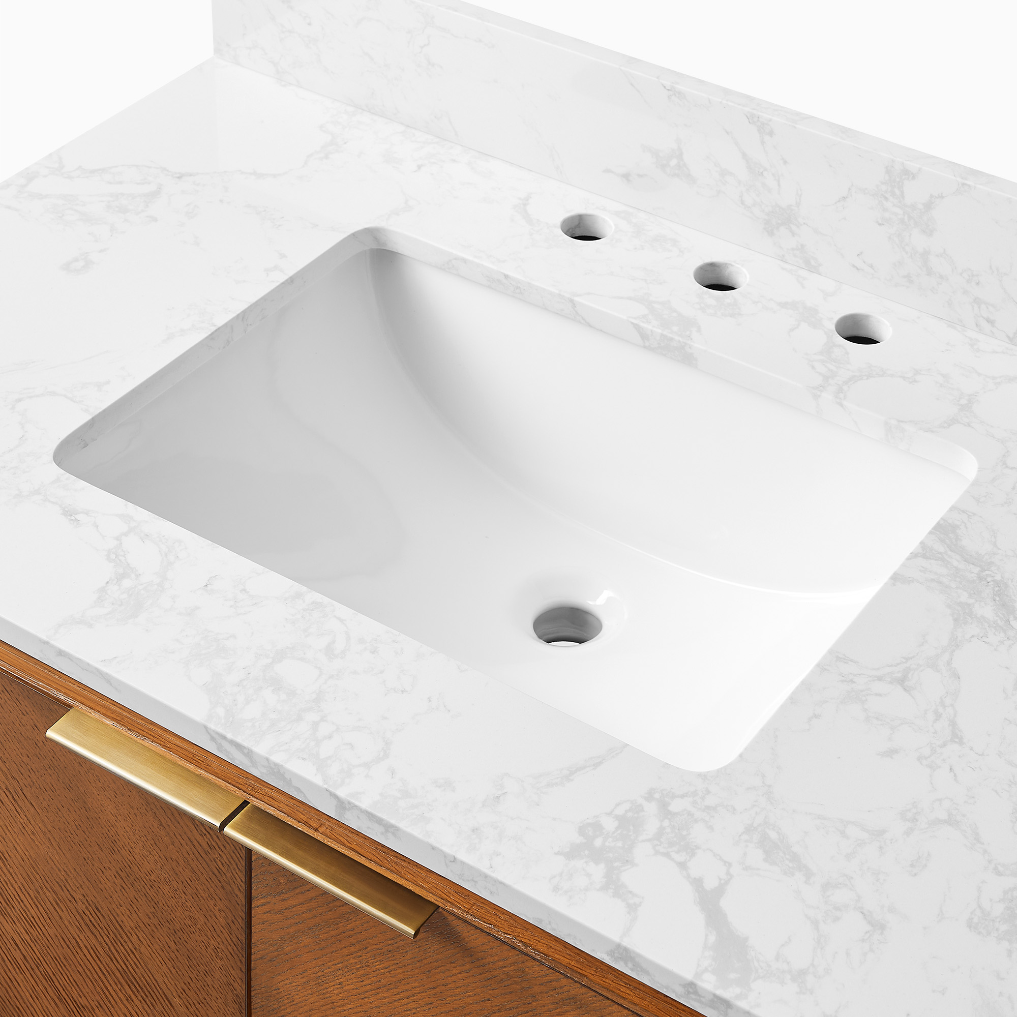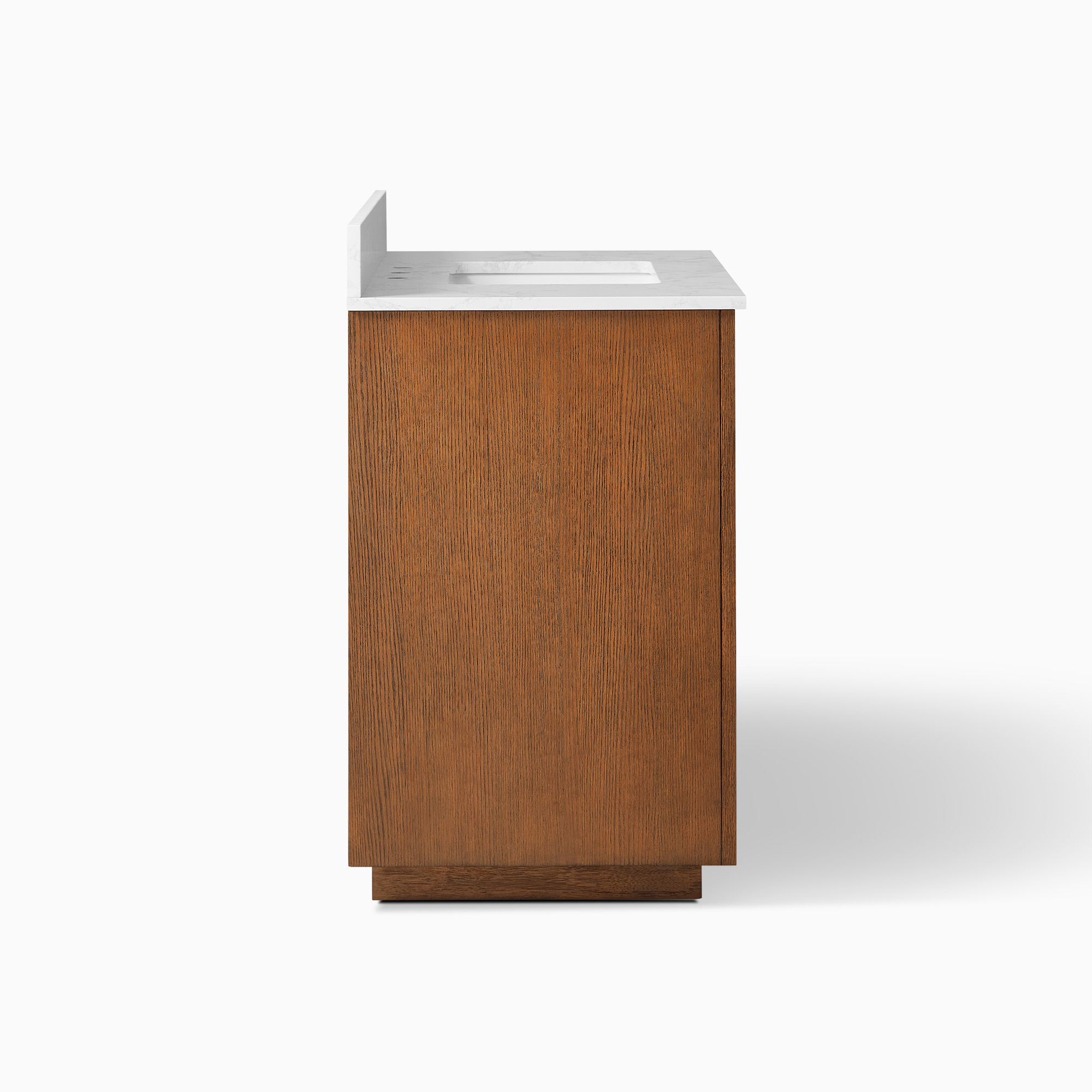 Stylish Single Bathroom Vanity with sink featuring wood with a unique textured pattern. Includes a crisp white marble top and ample cabinet storage to refresh your space.color:Brown, material:Plywood, material:Solid Wood, finish:Oak Veneer, number of sinks:Single, material:Marble, number of shelves:2, faucet included:No, feature:Adjustable Shelves