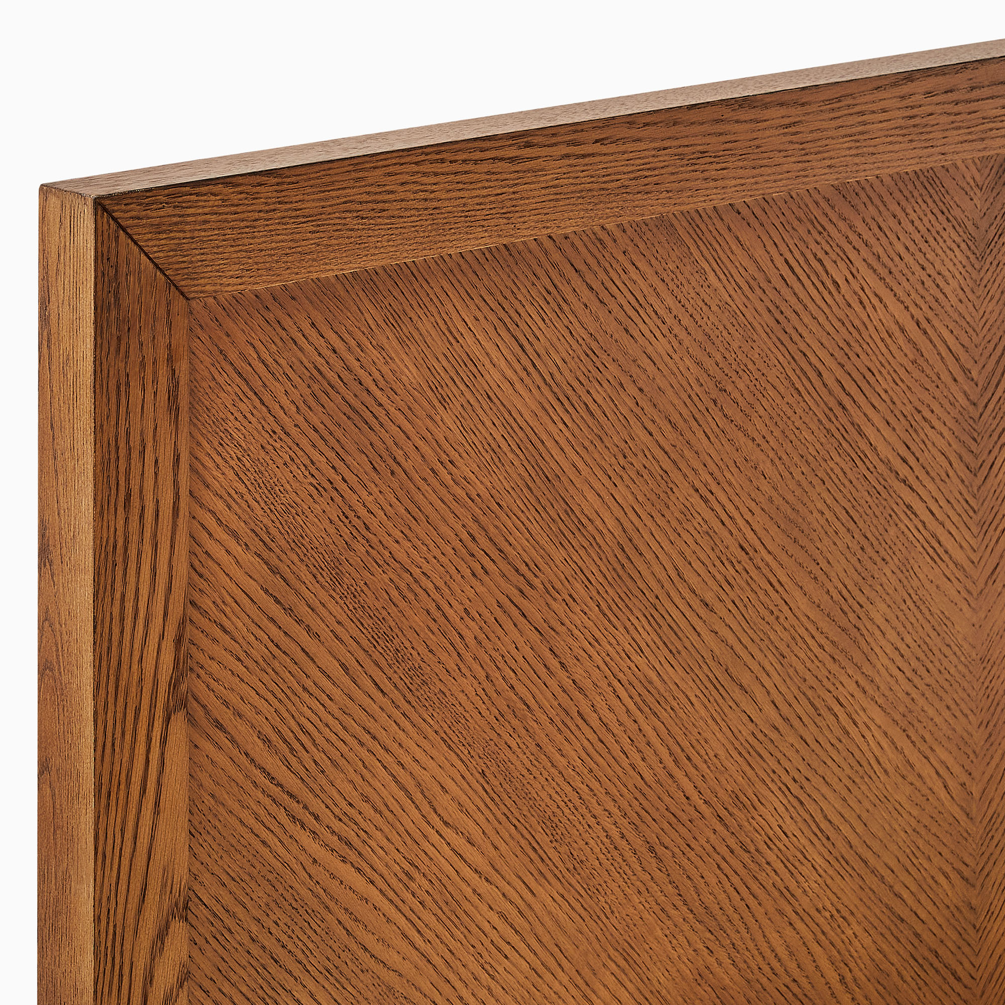 Discover the Thursen queen size bed, a stunning piece crafted with oak veneer over a sturdy frame made of solid oak, plywood, and engineered wood. The headboard features a timeless chevron pattern that adds a touch of elegance to your bedroom.frame material:Oak, frame material:Engineered Wood, frame material:Plywood, bed size:Queen Size, color:Reddish Brown