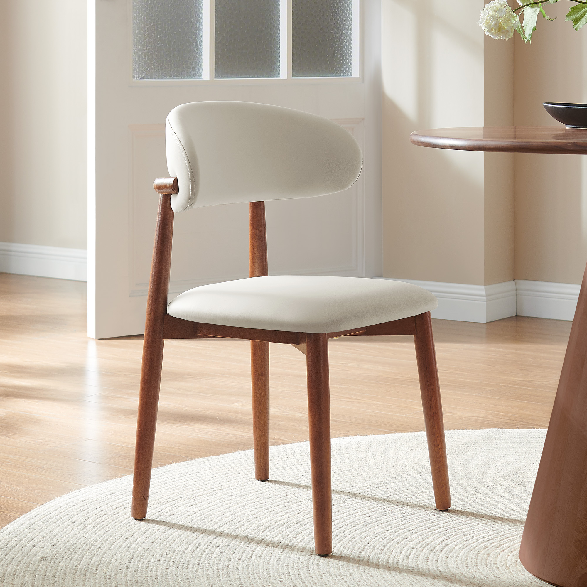 This modern dining chair, featuring a curved back and solid cast wood legs, complements the rustic nature of the wood with a contemporary design. The unique curved backrest design not only provides comfortable support but also adds elegance and smoothness to the entire space.color:Brown, unit count:2 PCS, back design:Upholstered Back, upholstery material:PU Leather, filling:Foam, color:Beige, frame material:Rubber Wood, armrest design:Armless, max bearing weight:330 lbs