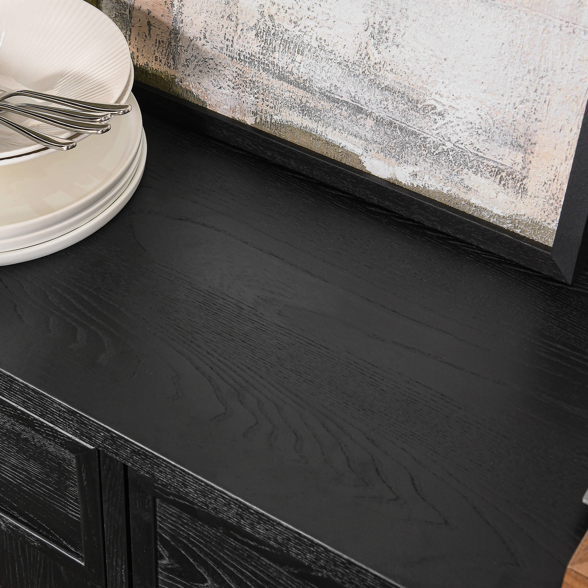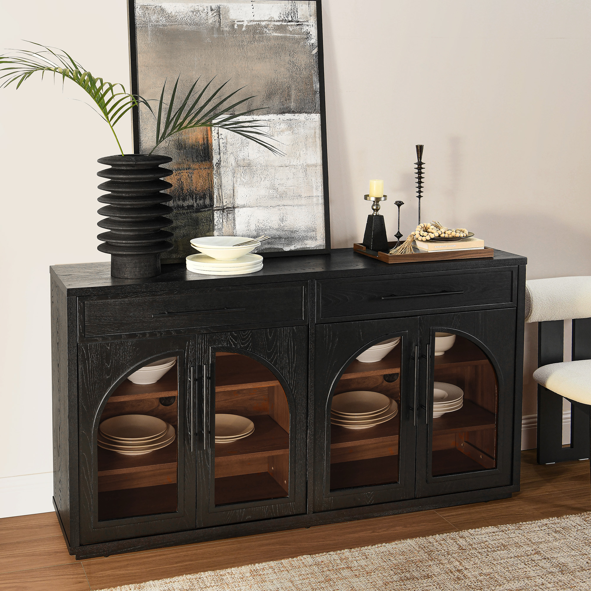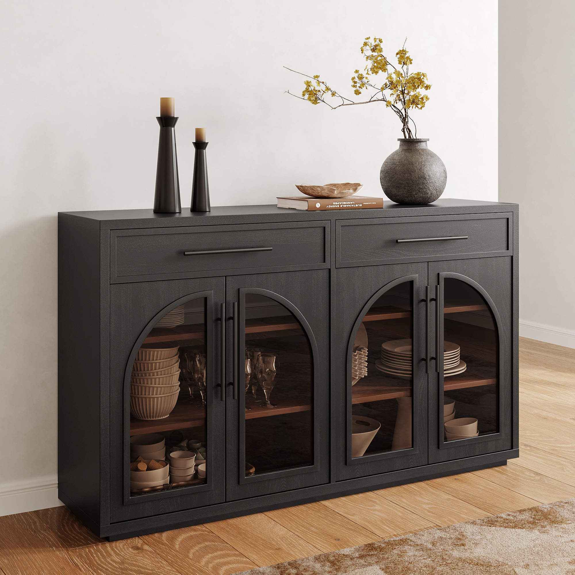 Elegant black wood sideboard featuring arched glass doors and ample storage with 2 drawers and adjustable shelves. Its rich wood finish adds warmth and sophistication to any dining space.color:Black, sideboard type:Sideboard, material:Solid Wood, material:Plywood, material:Tempered Glass, finish:Elm Veneer, number of drawers:2, number of shelves:6, feature:Adjustable Shelves