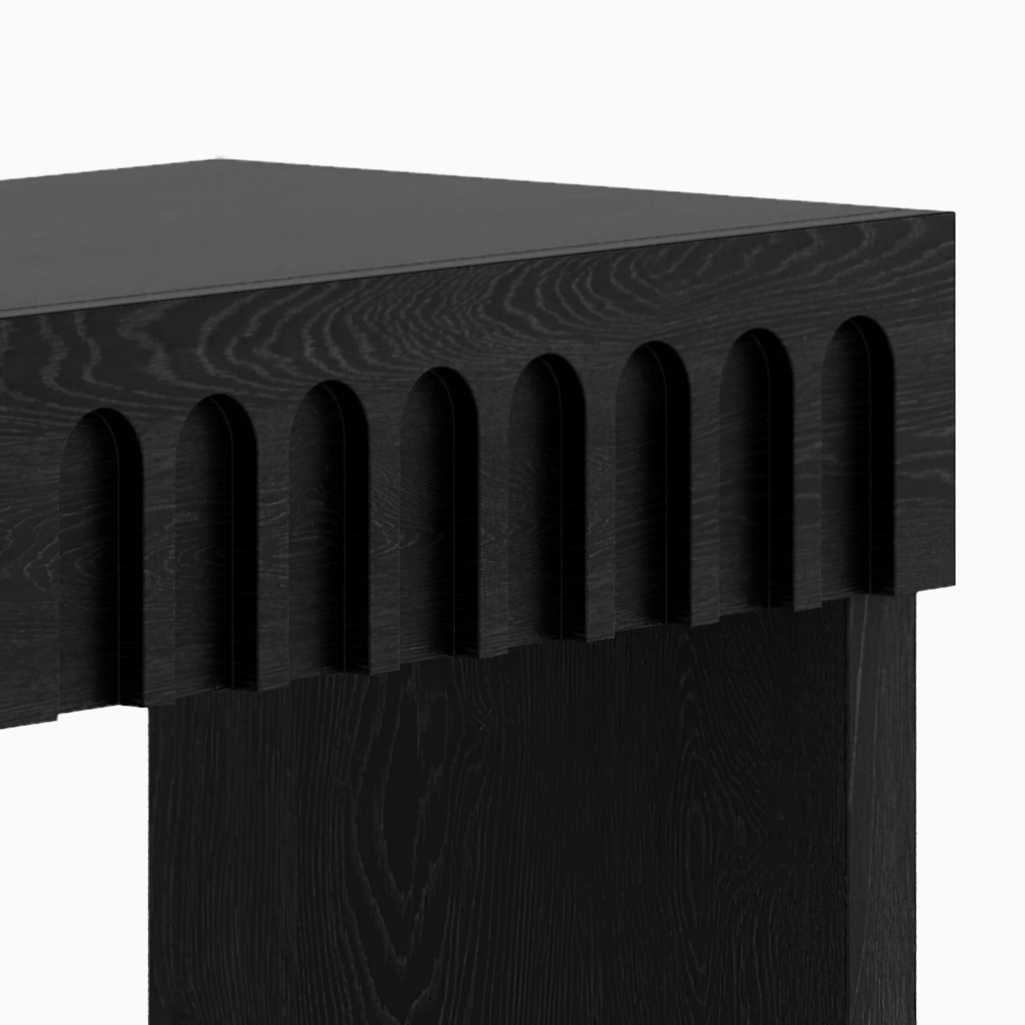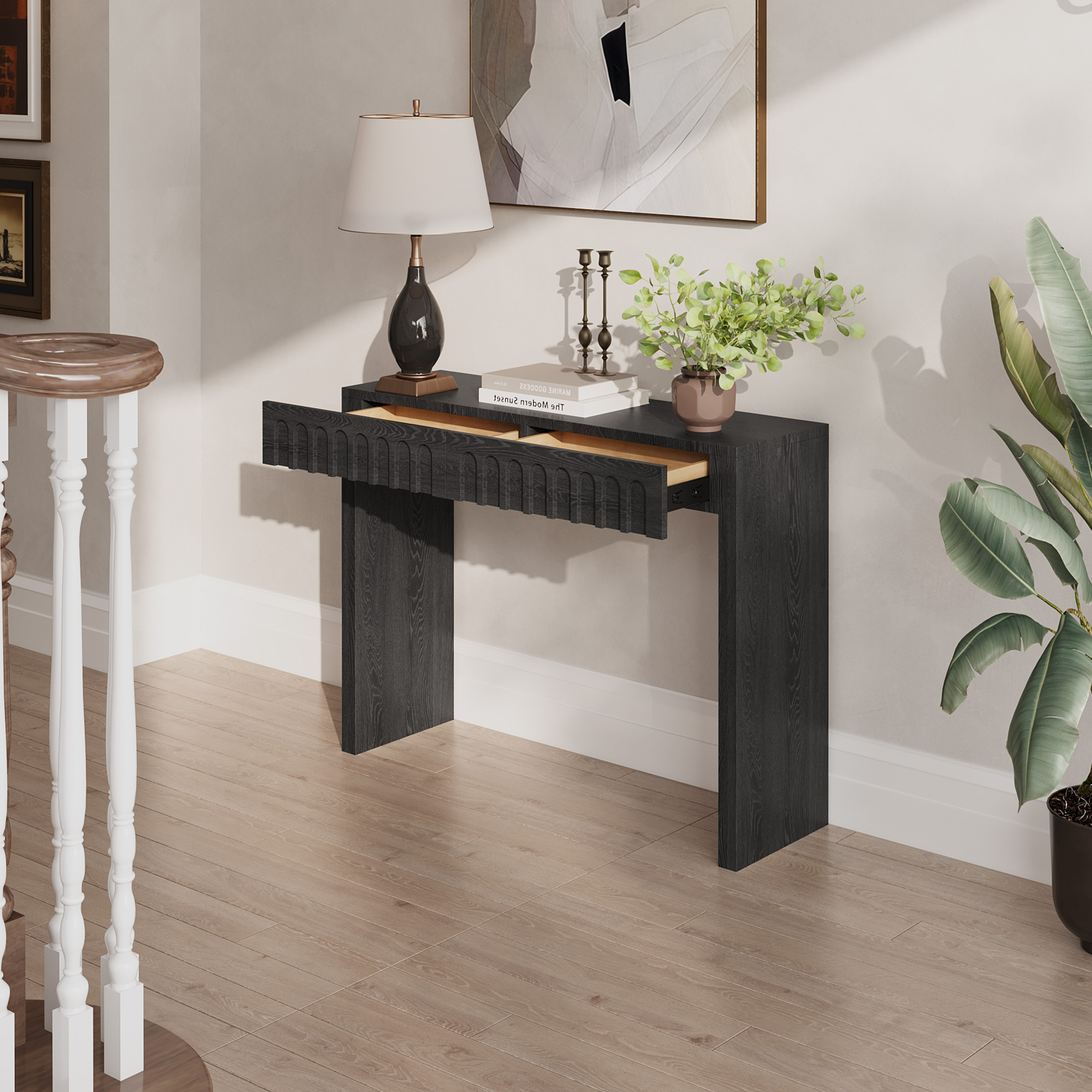 Seeking chic storage? Our black console table offers drawer space and stylish arch details. Perfect for hallways or living rooms. Add a touch of modern drama.color:Black, shape:Rectangular, tabletop material:Engineered Wood, finish:Ash Wood Veneer, material of drawers:Solid Wood, number of drawers:2, material:Engineered Wood, material:Solid Wood